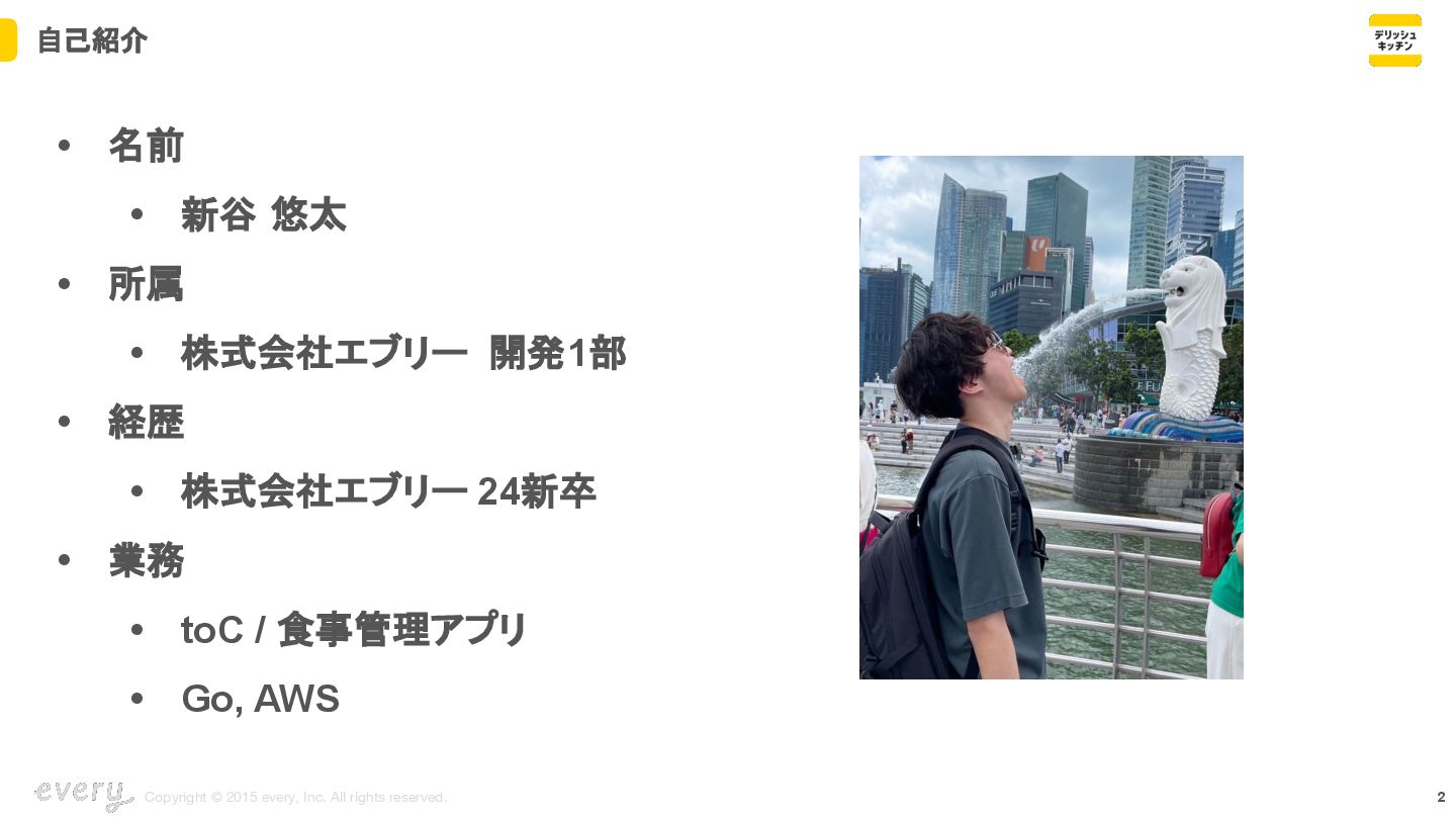 • 名前 • 新谷 悠太 • 所属 • 株式会社エブリー 開発1部 • 経歴 • 株式会社エブリー 24新卒 • 業務 • toC / 食事管理アプリ • Go, AWS
