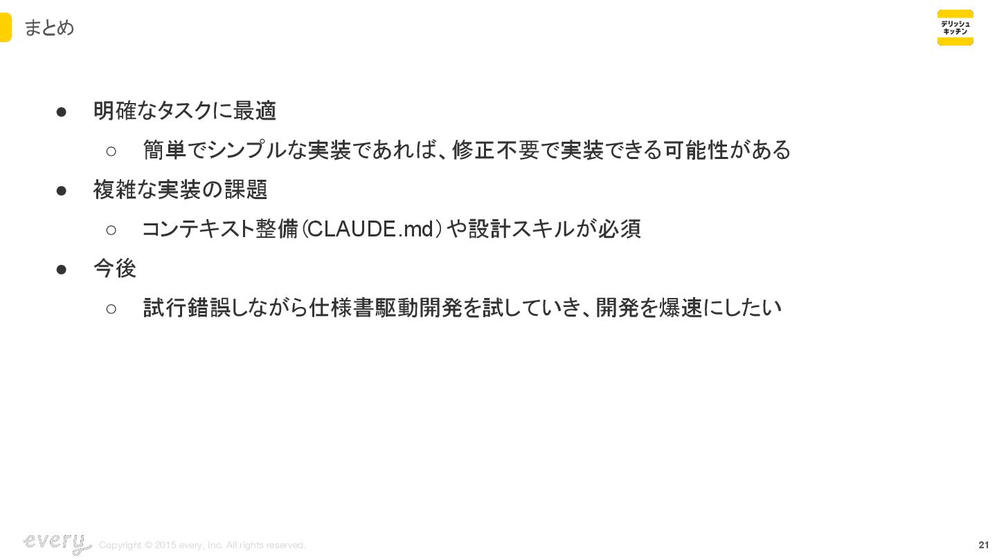 • 明確なタスクに最適 ◦ 簡単でシンプルな実装であれば、修正不要で実装できる可能性がある • 複雑な実装の課題 ◦ コンテキスト整備(CLAUDE.md)や設計スキルが必須 • 今後 ◦ 試行錯誤しながら仕様書駆動開発を試していき、開発を爆速にしたい