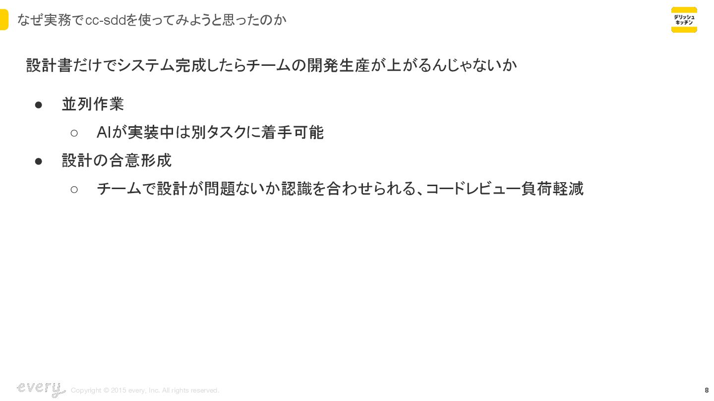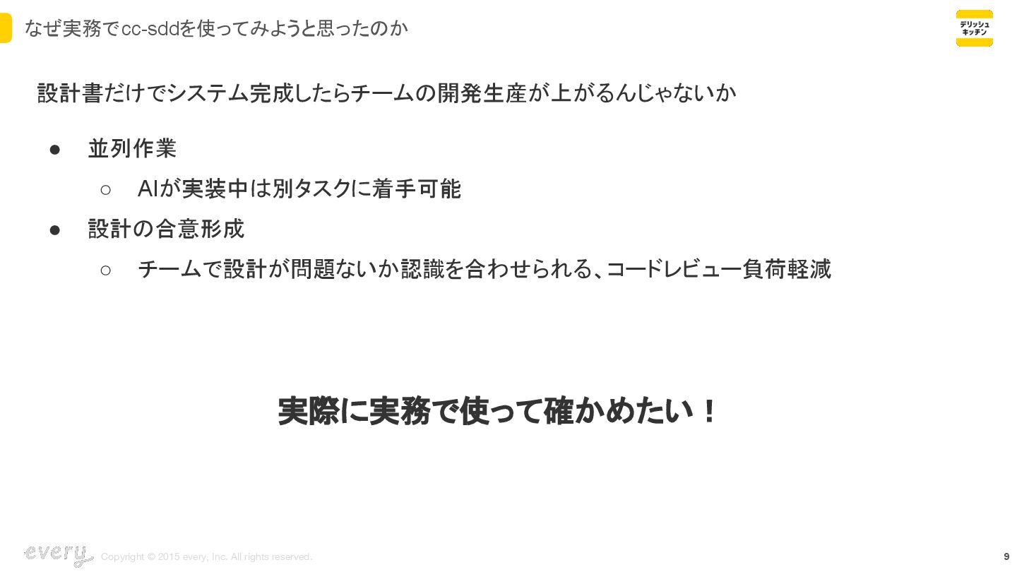 8 Copyright © 2015 every, Inc. All rights reserved. なぜ実務でcc-sddを使ってみようと思ったのか