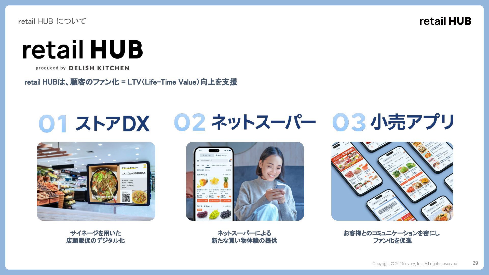 HUB について サイネージを用いた 店頭販促のデジタル化 ネットスーパーによる 新たな買い物体験の提供 お客様とのコミュニケーションを密にし ファン化を促進 retail HUBは、顧客のファン化 = LTV(Life-Time Value)向上を支援