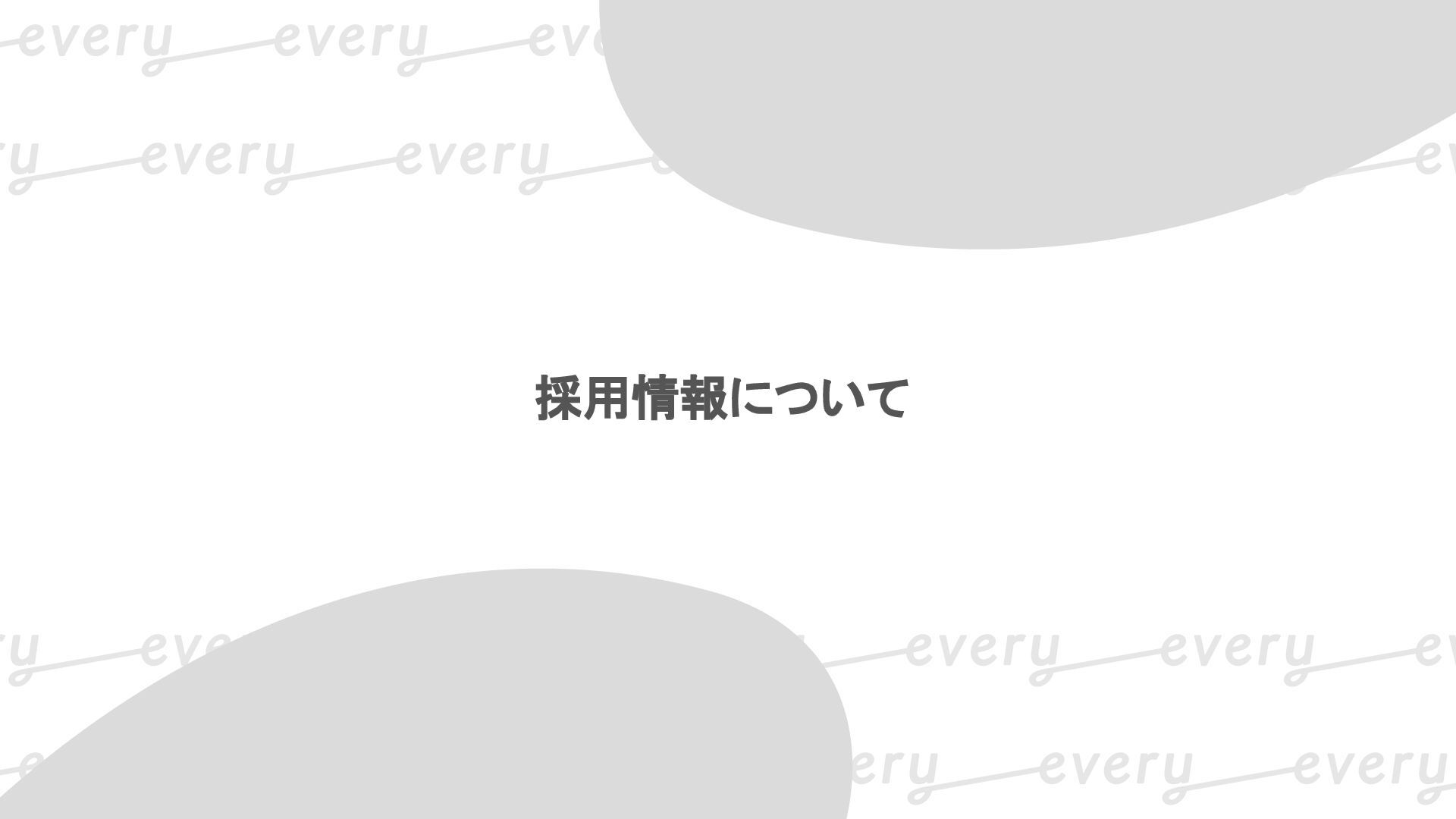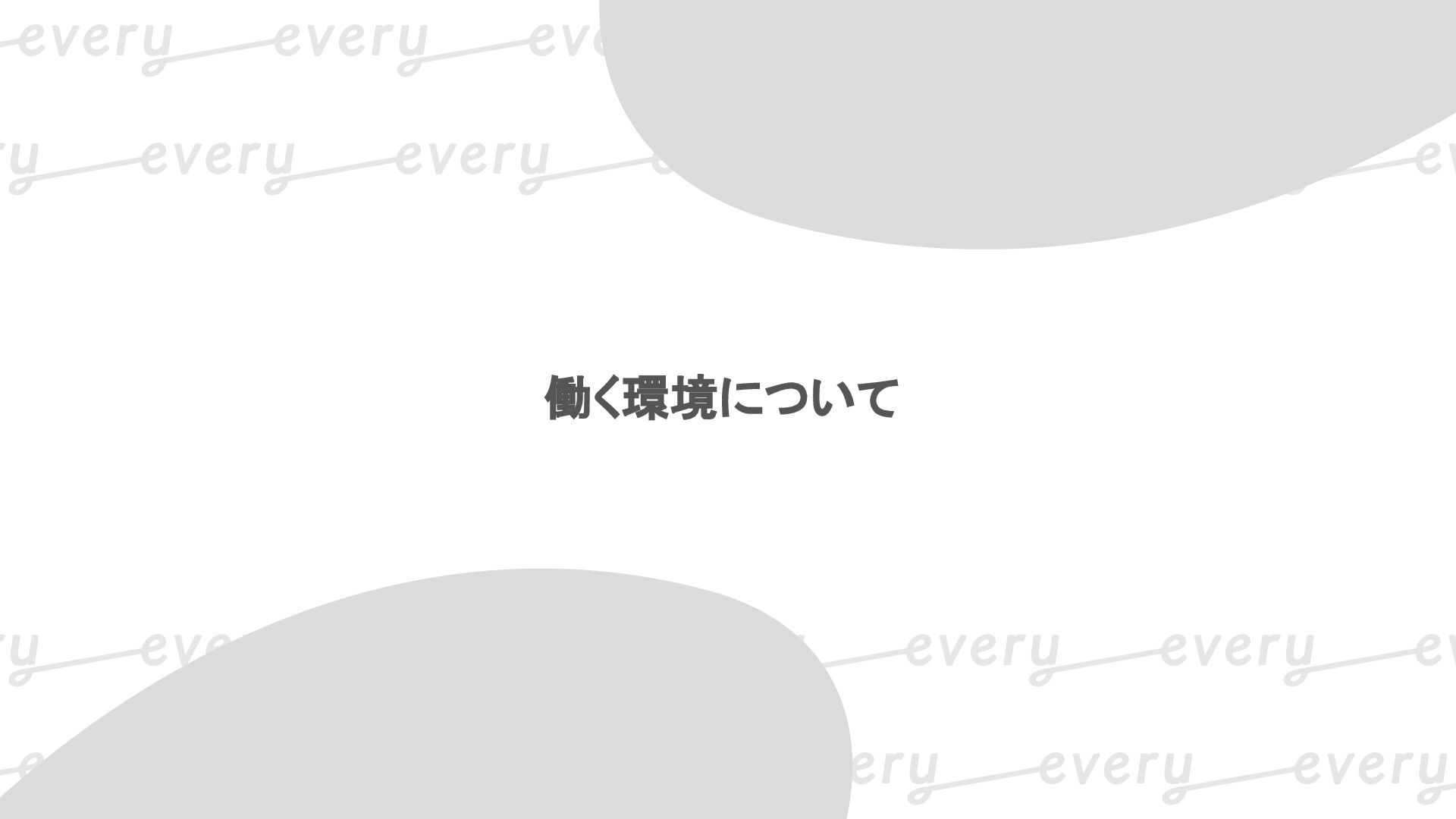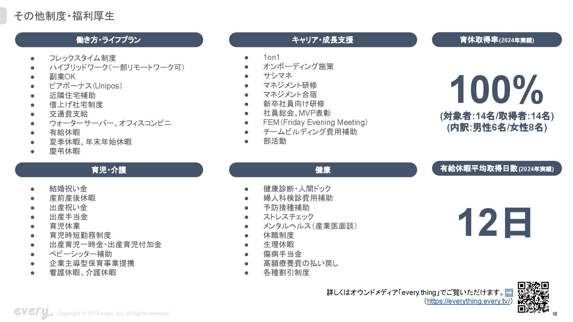 フレックスタイム制度 • ハイブリッドワーク(一部リモートワーク可) • 副業OK • ピアボーナス(Unipos) • 近隣住宅補助 • 借上げ社宅制度 • 交通費支給 • ウォーターサーバー、オフィスコンビニ • 有給休暇 • 夏季休暇、年末年始休暇 • 慶弔休暇 • 1on1 • オンボーディング施策 • サシマネ • マネジメント研修 • マネジメント合宿 • 新卒社員向け研修 • 社員総会、MVP表彰 • FEM(Friday Evening Meeting) • チームビルディング費用補助 • 部活動 • 結婚祝い金 • 産前産後休暇 • 出産祝い金 • 出産手当金 • 育児休業 • 育児時短勤務制度 • 出産育児一時金・出産育児付加金 • ベビーシッター補助 • 企業主導型保育事業提携 • 看護休暇、介護休暇 • 健康診断・人間ドック • 婦人科検診費用補助 • 予防接種補助 • ストレスチェック • メンタルヘルス(産業医面談) • 休職制度 • 生理休暇 • 傷病手当金 • 高額療養費の払い戻し • 各種割引制度 働き方・ライフプラン キャリア・成長支援 育児・介護 健康 育休取得率(2024年実績) 有給休暇平均取得日数(2024年実績) 100% 12日 (対象者:14名/取得者:14名) (内訳:男性6名/女性8名) その他制度・福利厚生 詳しくはオウンドメディア「every.thing」でご覧いただけます。➡ (https://everything.every.tv/)