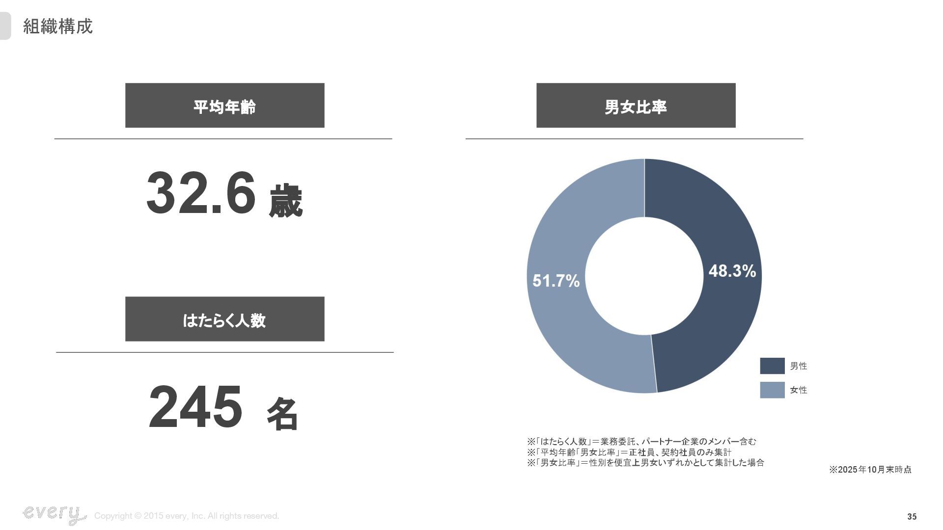 はたらく人数 32.6 歳 平均年齢 245 名 男女比率 ※「はたらく人数」=業務委託、パートナー企業のメンバー含む ※「平均年齢「男女比率」=正社員、契約社員のみ集計 ※「男女比率」=性別を便宜上男女いずれかとして集計した場合 男性 女性 ※2025年10月末時点
