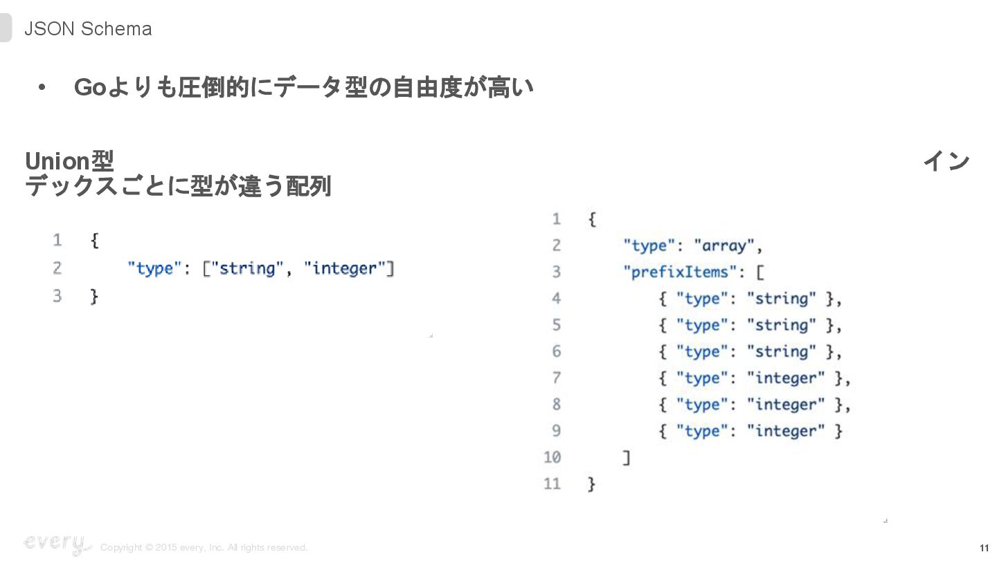 Schema • Goよりも圧倒的にデータ型の自由度が高い Union型 イン デックスごとに型が違う配列