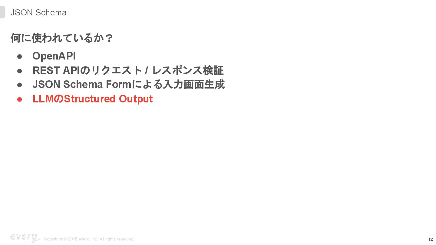Schema 何に使われているか? • OpenAPI • REST APIのリクエスト / レスポンス検証 • JSON Schema Formによる入力画面生成 • LLMのStructured Output