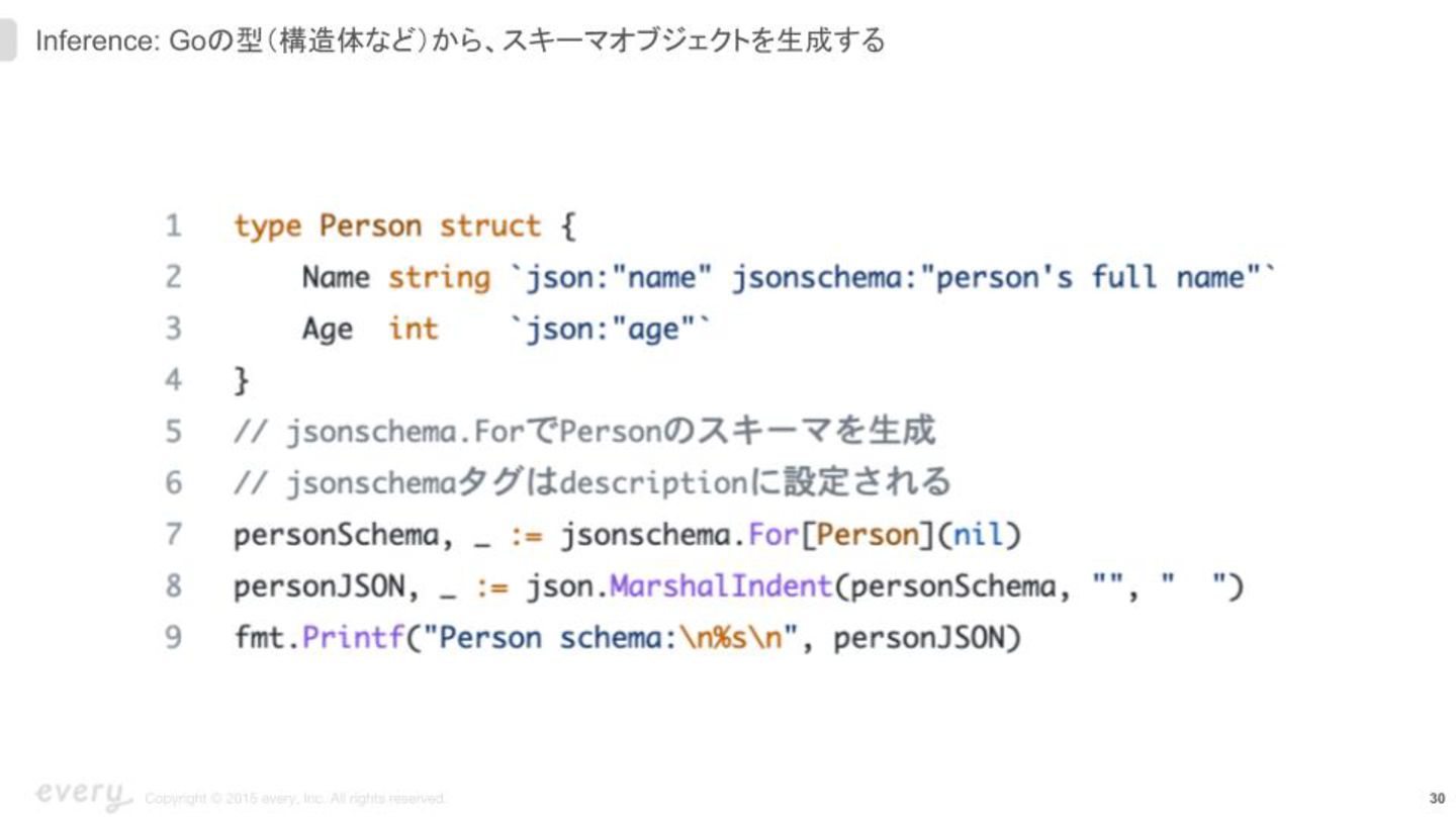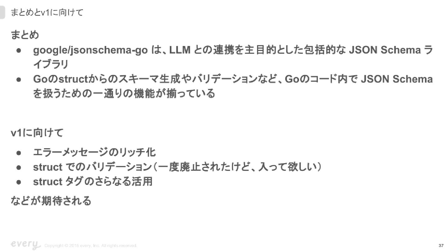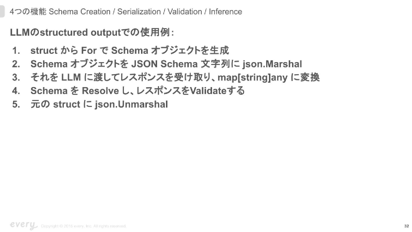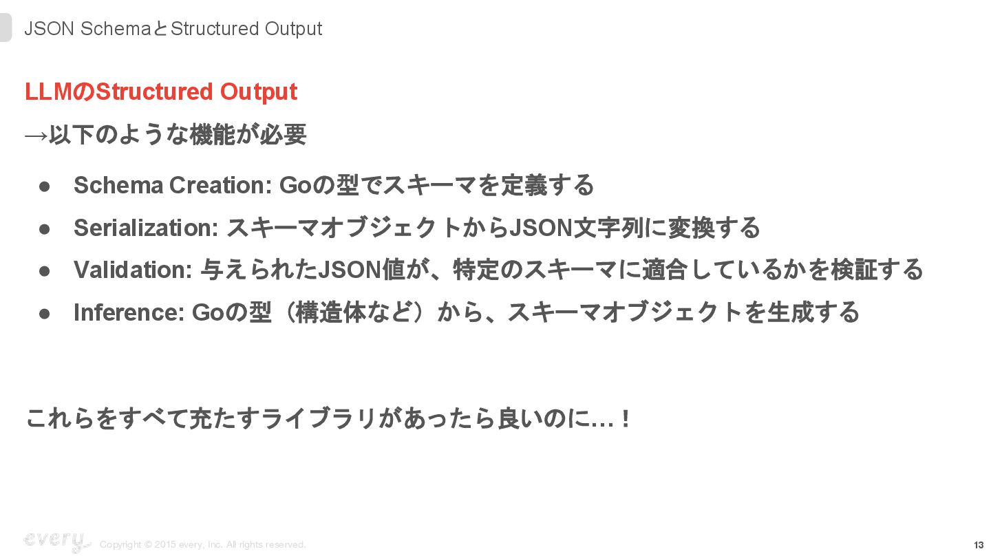 SchemaとStructured Output LLMのStructured Output →以下のような機能が必要 • Schema Creation: Goの型でスキーマを定義する • Serialization: スキーマオブジェクトからJSON文字列に変換する • Validation: 与えられたJSON値が、特定のスキーマに適合しているかを検証する • Inference: Goの型(構造体など)から、スキーマオブジェクトを生成する これらをすべて充たすライブラリがあったら良いのに…!