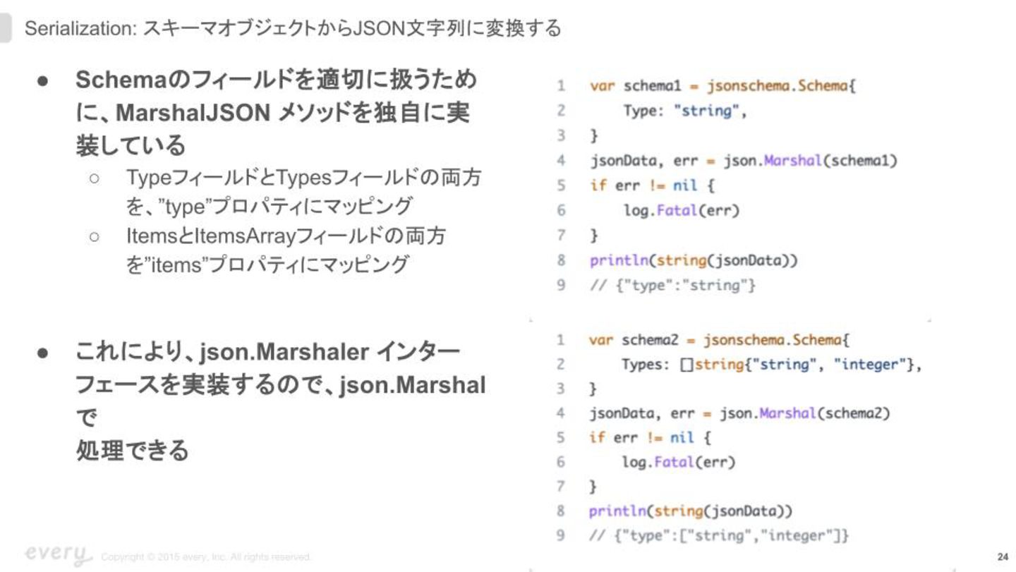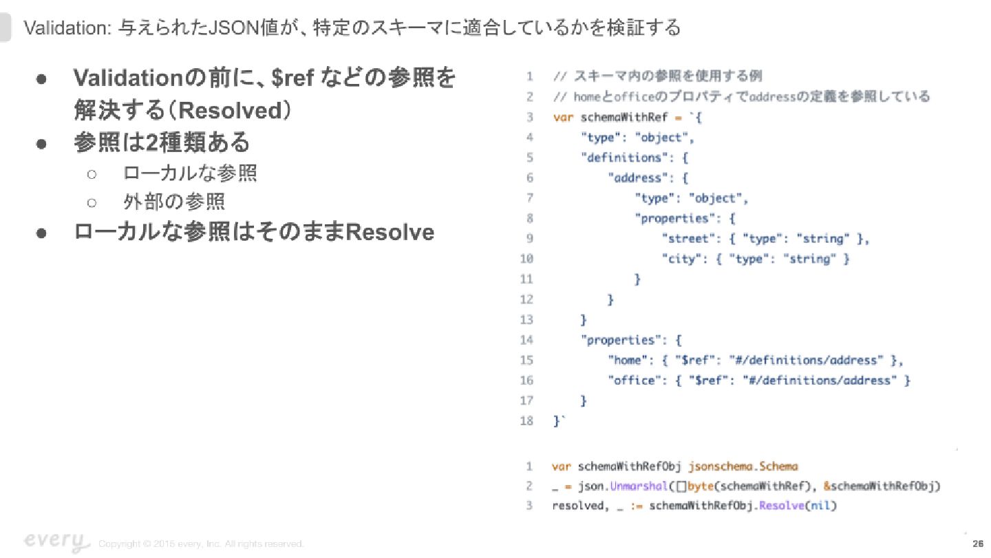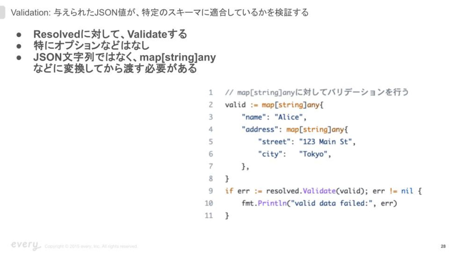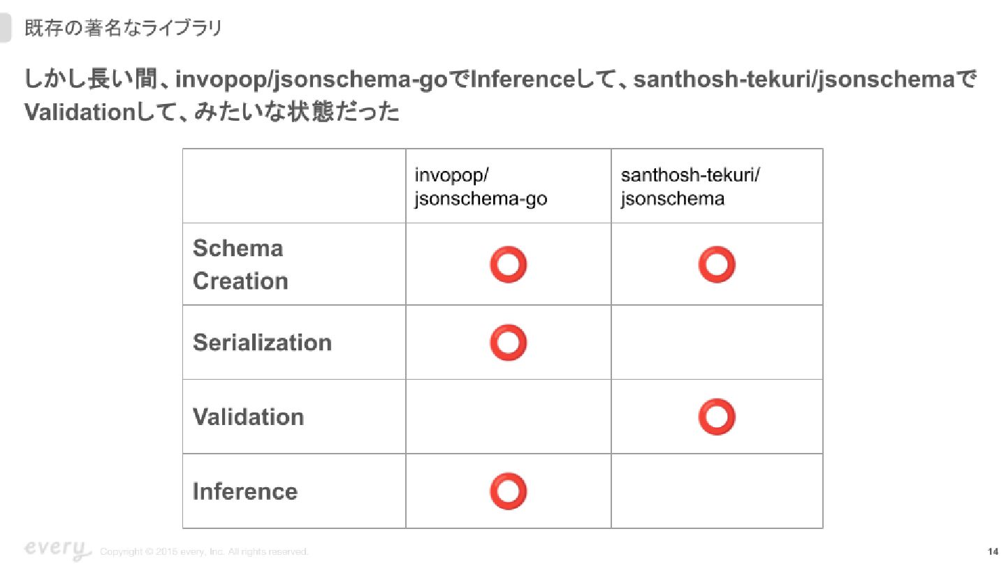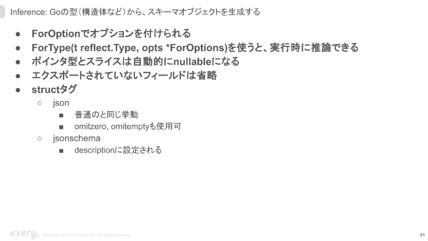 SchemaとStructured Output LLMのStructured Output →以下のような機能が必要 • Schema Creation: Goの型でスキーマを定義する • Serialization: スキーマオブジェクトからJSON文字列に変換する • Validation: 与えられたJSON値が、特定のスキーマに適合しているかを検証する • Inference: Goの型(構造体など)から、スキーマオブジェクトを生成する これらをすべて充たすライブラリがあったら良いのに…!
