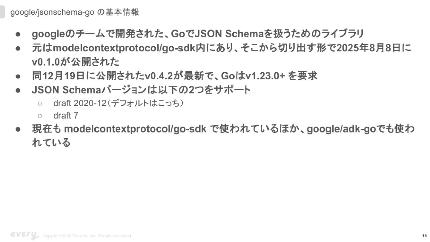 MCP Go SDKとともに登場したJSON Schemaライブラリ google/jsonschema-go 。 今日はこのライブラリが作られた背景とその機能の深掘りを通して google/jsonschema-go は何ができるのか を皆さんに知ってもらうことを目指します。
