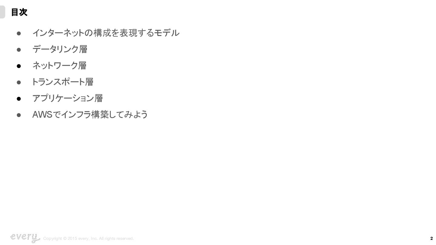 インターネットの構成を表現するモデル • データリンク層 • ネットワーク層 • トランスポート層 • アプリケーション層 • AWSでインフラ構築してみよう 目次