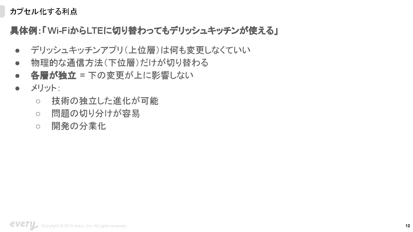 8. 12 Copyright © 2015 every, Inc. All rights reserved. 具体例:「Wi-FiからLTEに切り替わってもデリッシュキッチンが使える」