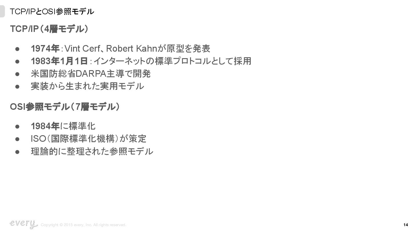 9. 14 Copyright © 2015 every, Inc. All rights reserved. TCP/IP(4層モデル)