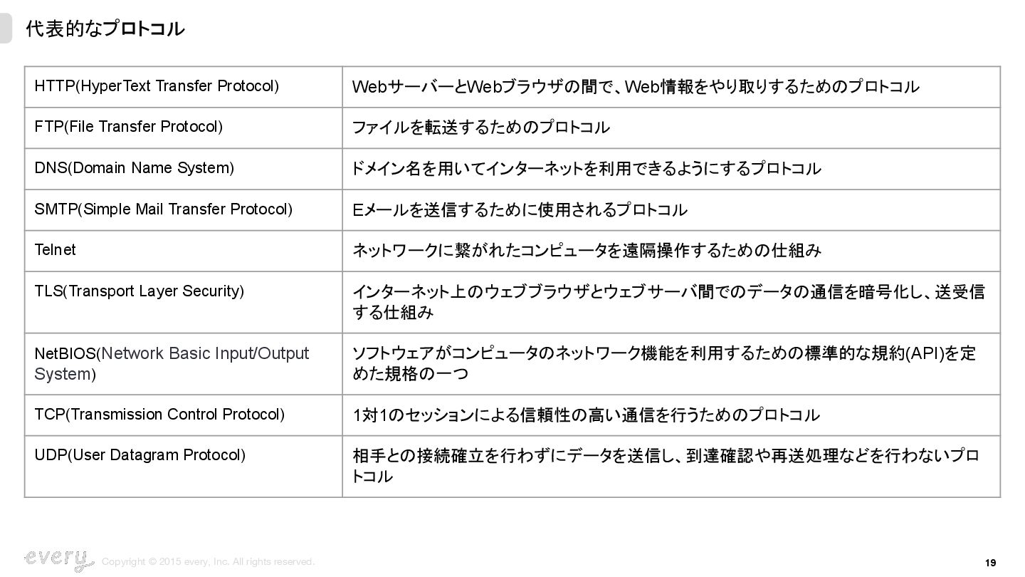 14. Copyright © 2015 every, Inc. All rights reserved. 19 代表的なプロトコル