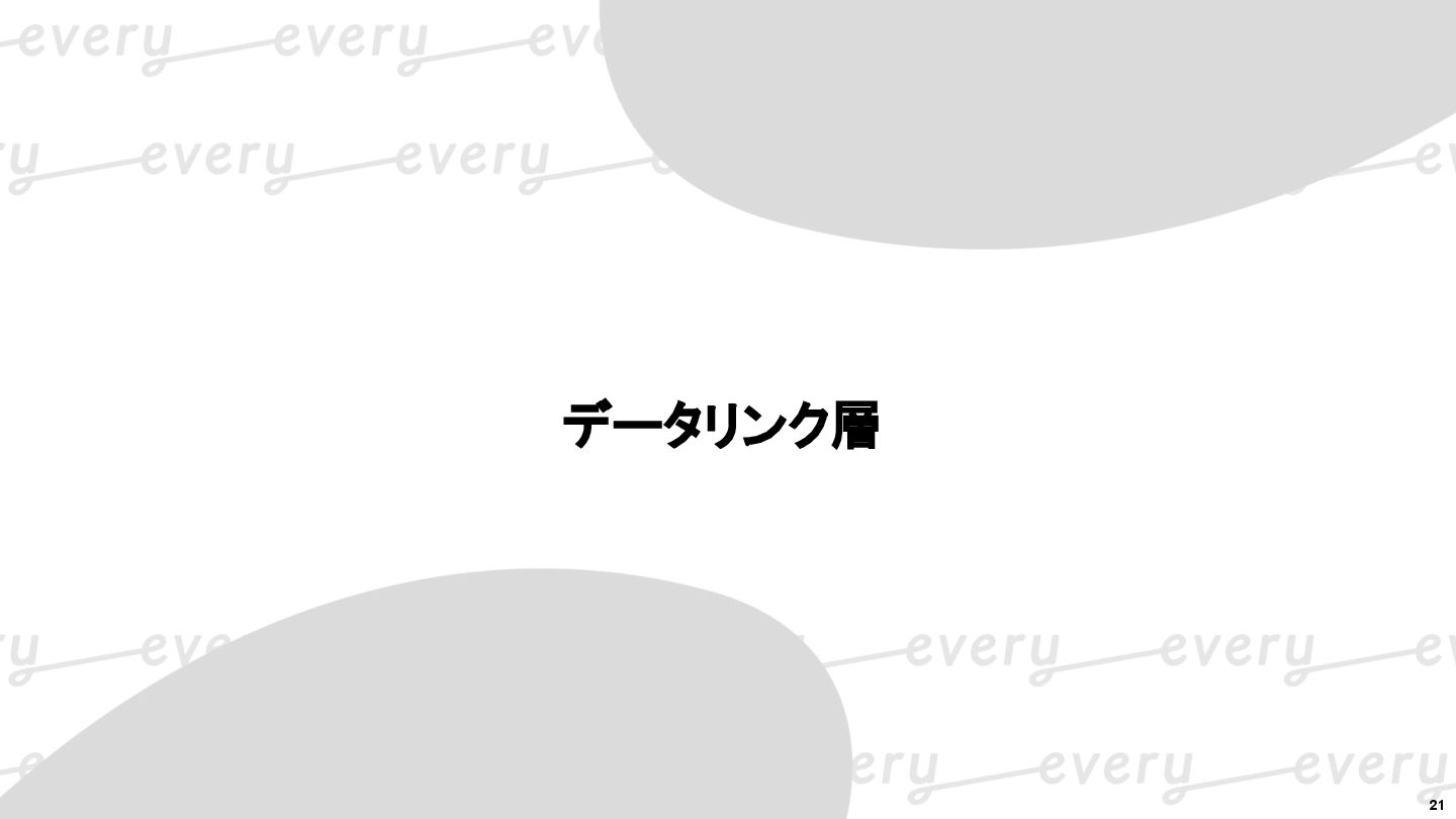• データリンク層は通信機器(ハードウェア)同士の通信を担当する • キーワード:イーサネット(Ethernet)、MACアドレス レイヤー 階層 概要 7層 アプリケーション層 個々のアプリケーション 6層 プレゼンテーション層 データの表現形式 5層 セッション層 通信手段 4層 トランスポート層 エンド間の通信 3層 ネットワーク層 データを送る相手を決め、最適な経路で送信 2層 データリンク層 隣接する機器同士の通信を実現 1層 物理層 物理的な接続、電気信号 代表的なプロトコル HTTP,FTP,DNSなど SMTP,FTP,Telnetなど TLS,NetBIOSなど TCP,UDP ,NetWare/IPなど IP,ARP,RARP,ICMPなど PPP,Ethernetなど RS-232,UTPなど