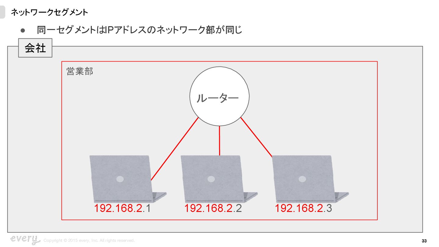 同一セグメントはIPアドレスのネットワーク部が同じ ネットワークセグメント 会社 営業部 192.168.2.1 192.168.2.2 192.168.2.3 ルーター