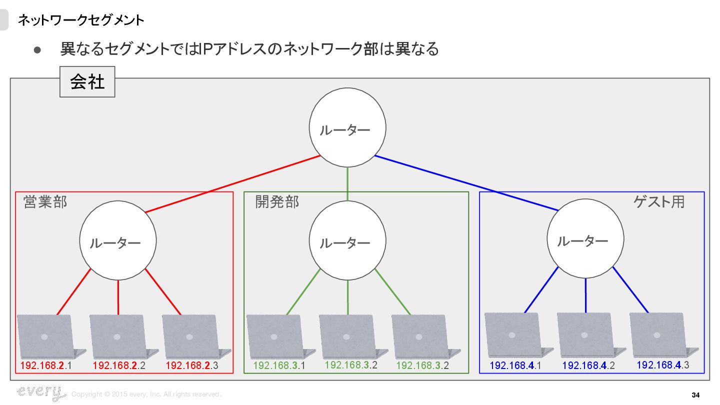 異なるセグメントではIPアドレスのネットワーク部は異なる ネットワークセグメント ルーター 会社 ルーター ルーター ルーター 営業部 開発部 ゲスト用 192.168.2.1 192.168.2.2 192.168.2.3 192.168.3.1 192.168.3.2 192.168.3.2 192.168.4.1 192.168.4.2 192.168.4.3