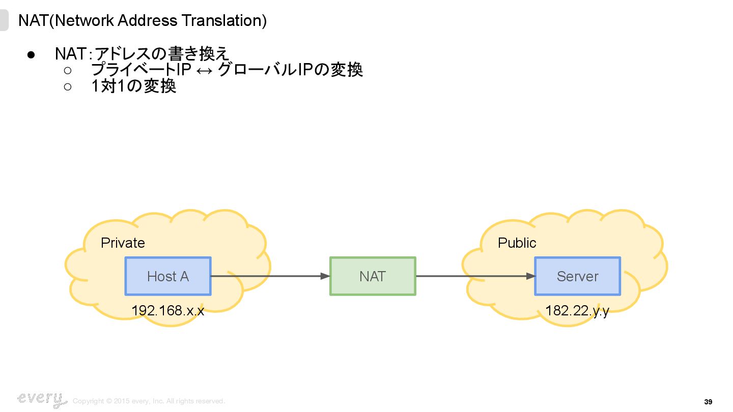 NAT:アドレスの書き換え ◦ プライベートIP ↔ グローバルIPの変換 ◦ 1対1の変換 NAT(Network Address Translation) NAT Private Host A Public Server 192.168.x.x 182.22.y.y