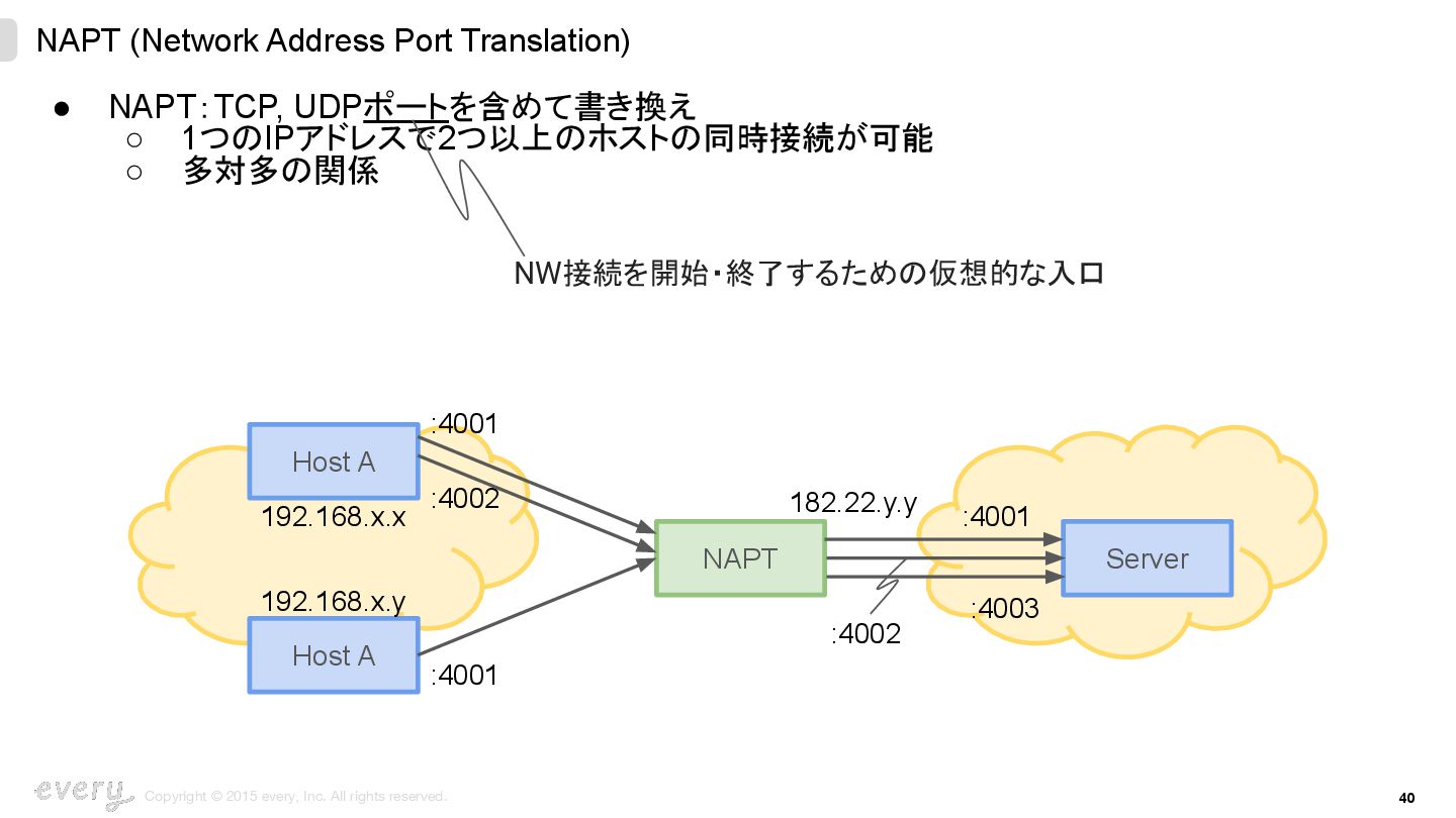 NAPT:TCP, UDPポートを含めて書き換え ◦ 1つのIPアドレスで2つ以上のホストの同時接続が可能 ◦ 多対多の関係 NAPT (Network Address Port Translation) NAPT Host A Server 192.168.x.x 182.22.y.y Host A 192.168.x.y :4001 :4002 :4001 :4001 :4002 :4003 NW接続を開始・終了するための仮想的な入口