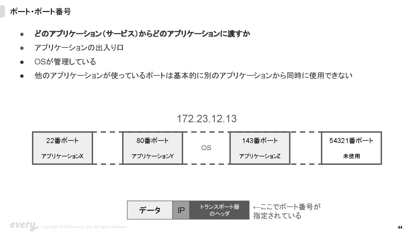 どのアプリケーション(サービス)からどのアプリケーションに渡すか • アプリケーションの出入り口 • OSが管理している • 他のアプリケーションが使っているポートは基本的に別のアプリケーションから同時に使用できない ポート・ポート番号 22番ポート アプリケーションX 80番ポート アプリケーションY 143番ポート アプリケーションZ 54321番ポート 未使用 OS 172.23.12.13 データ IP トランスポート層 のヘッダ ←ここでポート番号が  指定されている