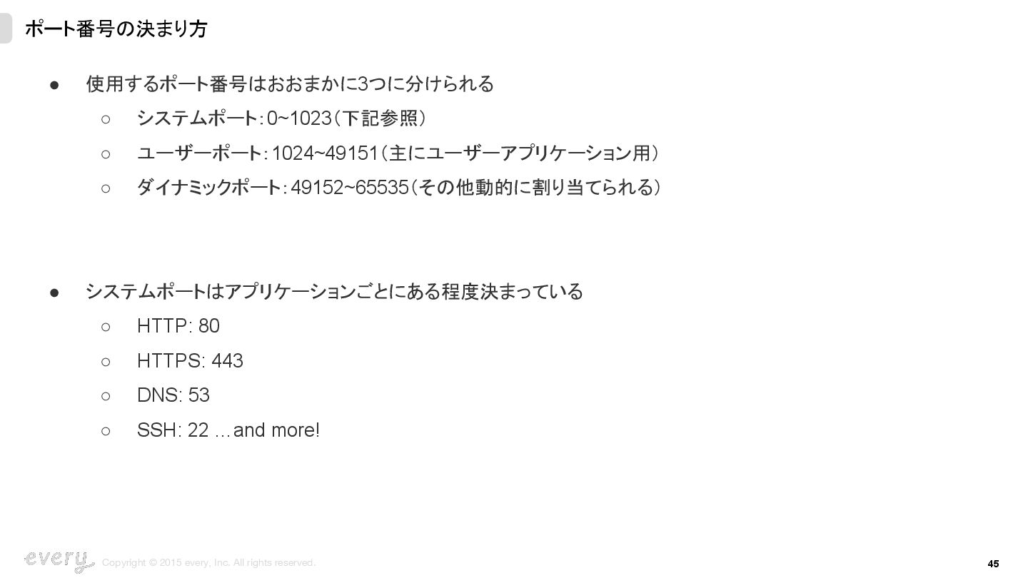 使用するポート番号はおおまかに3つに分けられる ◦ システムポート:0~1023(下記参照) ◦ ユーザーポート:1024~49151(主にユーザーアプリケーション用) ◦ ダイナミックポート:49152~65535(その他動的に割り当てられる) • システムポートはアプリケーションごとにある程度決まっている ◦ HTTP: 80 ◦ HTTPS: 443 ◦ DNS: 53 ◦ SSH: 22 …and more! ポート番号の決まり方