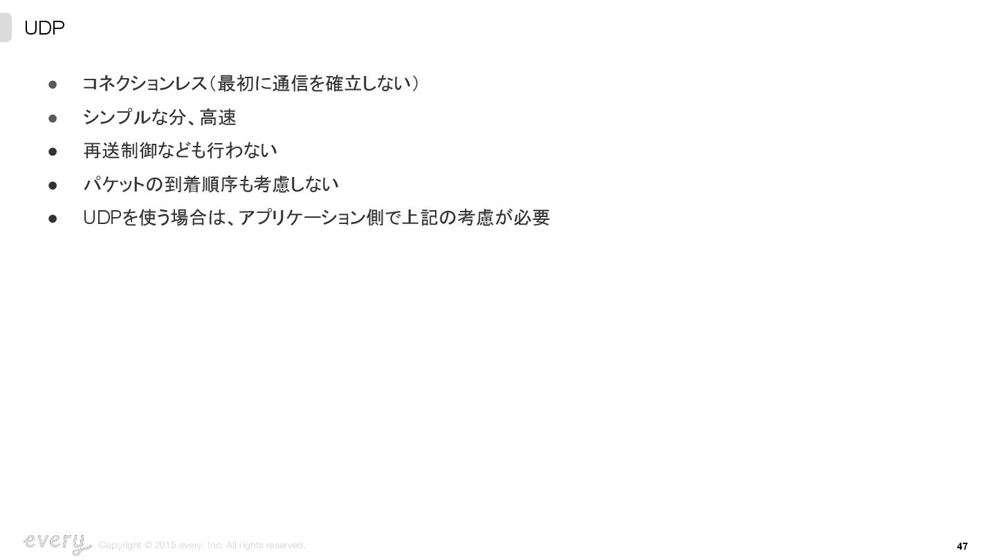 • コネクションレス(最初に通信を確立しない) • シンプルな分、高速 • 再送制御なども行わない • パケットの到着順序も考慮しない • UDPを使う場合は、アプリケーション側で上記の考慮が必要