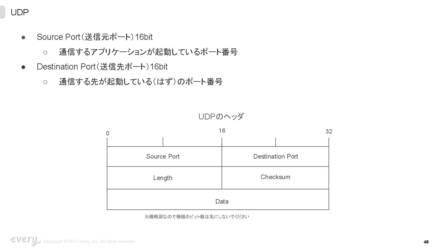 0 32 16 Source Port Length Data UDPのヘッダ ※概略図なので横幅のビット数は気にしないでください Destination Port Checksum • Source Port(送信元ポート)16bit ◦ 通信するアプリケーションが起動しているポート番号 • Destination Port(送信先ポート)16bit ◦ 通信する先が起動している(はず)のポート番号