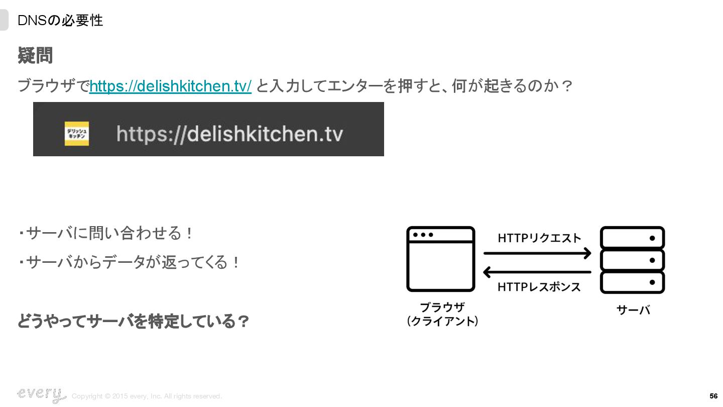 ブラウザでhttps://delishkitchen.tv/ と入力してエンターを押すと、何が起きるのか? ・サーバに問い合わせる! ・サーバからデータが返ってくる! どうやってサーバを特定している? DNSの必要性
