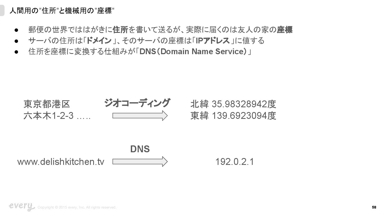 郵便の世界でははがきに住所を書いて送るが、実際に届くのは友人の家の座標 • サーバの住所は「ドメイン」、そのサーバの座標は「IPアドレス」に値する • 住所を座標に変換する仕組みが「DNS(Domain Name Service)」 人間用の”住所”と機械用の”座標” www.delishkitchen.tv 192.0.2.1 DNS 東京都港区 六本木1-2-3 ….. 北緯 35.98328942度 東緯 139.6923094度 ジオコーディング
