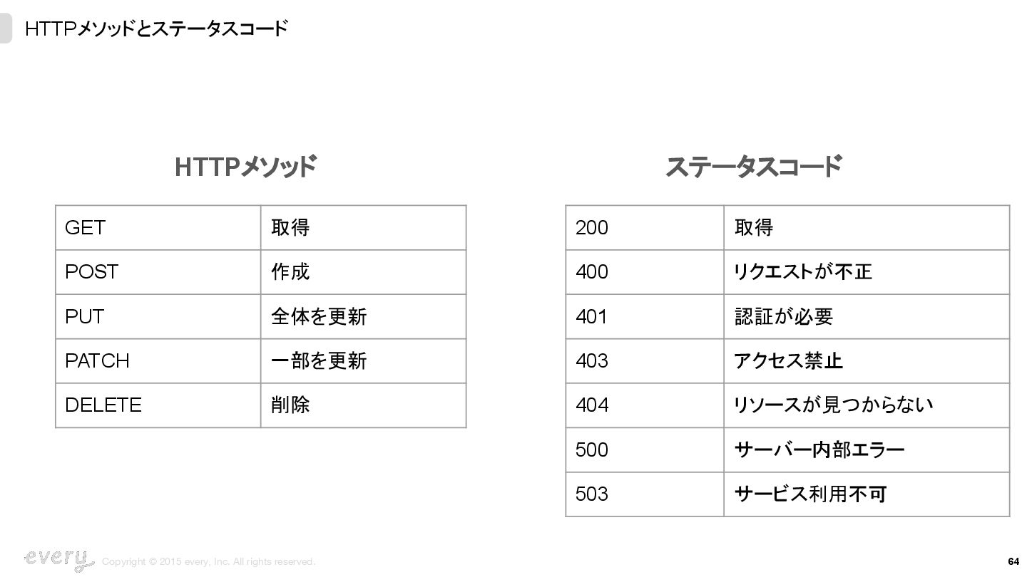 53. 64 Copyright © 2015 every, Inc. All rights reserved. HTTPメソッドとステータスコード