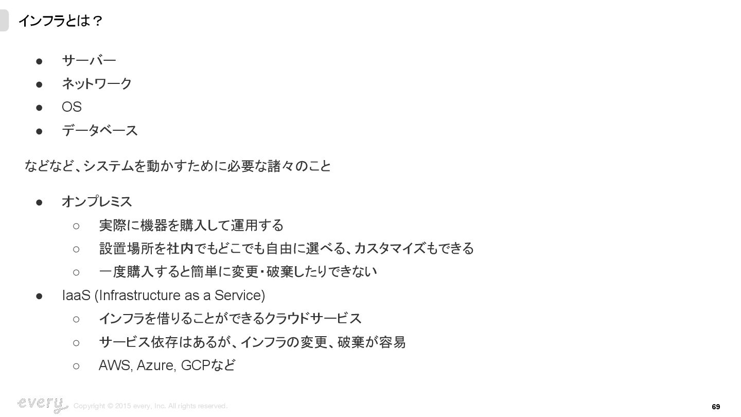 サーバー • ネットワーク • OS • データベース などなど、システムを動かすために必要な諸々のこと • オンプレミス ◦ 実際に機器を購入して運用する ◦ 設置場所を社内でもどこでも自由に選べる、カスタマイズもできる ◦ 一度購入すると簡単に変更・破棄したりできない • IaaS (Infrastructure as a Service) ◦ インフラを借りることができるクラウドサービス ◦ サービス依存はあるが、インフラの変更、破棄が容易 ◦ AWS, Azure, GCPなど インフラとは?
