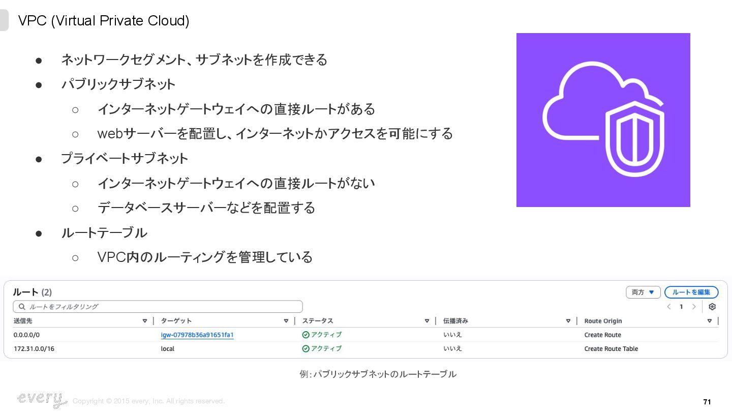 ネットワークセグメント、サブネットを作成できる • パブリックサブネット ◦ インターネットゲートウェイへの直接ルートがある ◦ webサーバーを配置し、インターネットかアクセスを可能にする • プライベートサブネット ◦ インターネットゲートウェイへの直接ルートがない ◦ データベースサーバーなどを配置する • ルートテーブル ◦ VPC内のルーティングを管理している VPC (Virtual Private Cloud) 例:パブリックサブネットのルートテーブル