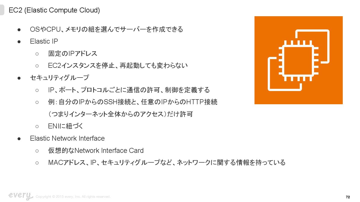 OSやCPU、メモリの組を選んでサーバーを作成できる • Elastic IP ◦ 固定のIPアドレス ◦ EC2インスタンスを停止、再起動しても変わらない • セキュリティグループ ◦ IP、ポート、プロトコルごとに通信の許可、制御を定義する ◦ 例:自分のIPからのSSH接続と、任意のIPからのHTTP接続 (つまりインターネット全体からのアクセス)だけ許可 ◦ ENIに紐づく • Elastic Network Interface ◦ 仮想的なNetwork Interface Card ◦ MACアドレス、IP、セキュリティグループなど、ネットワークに関する情報を持っている EC2 (Elastic Compute Cloud)