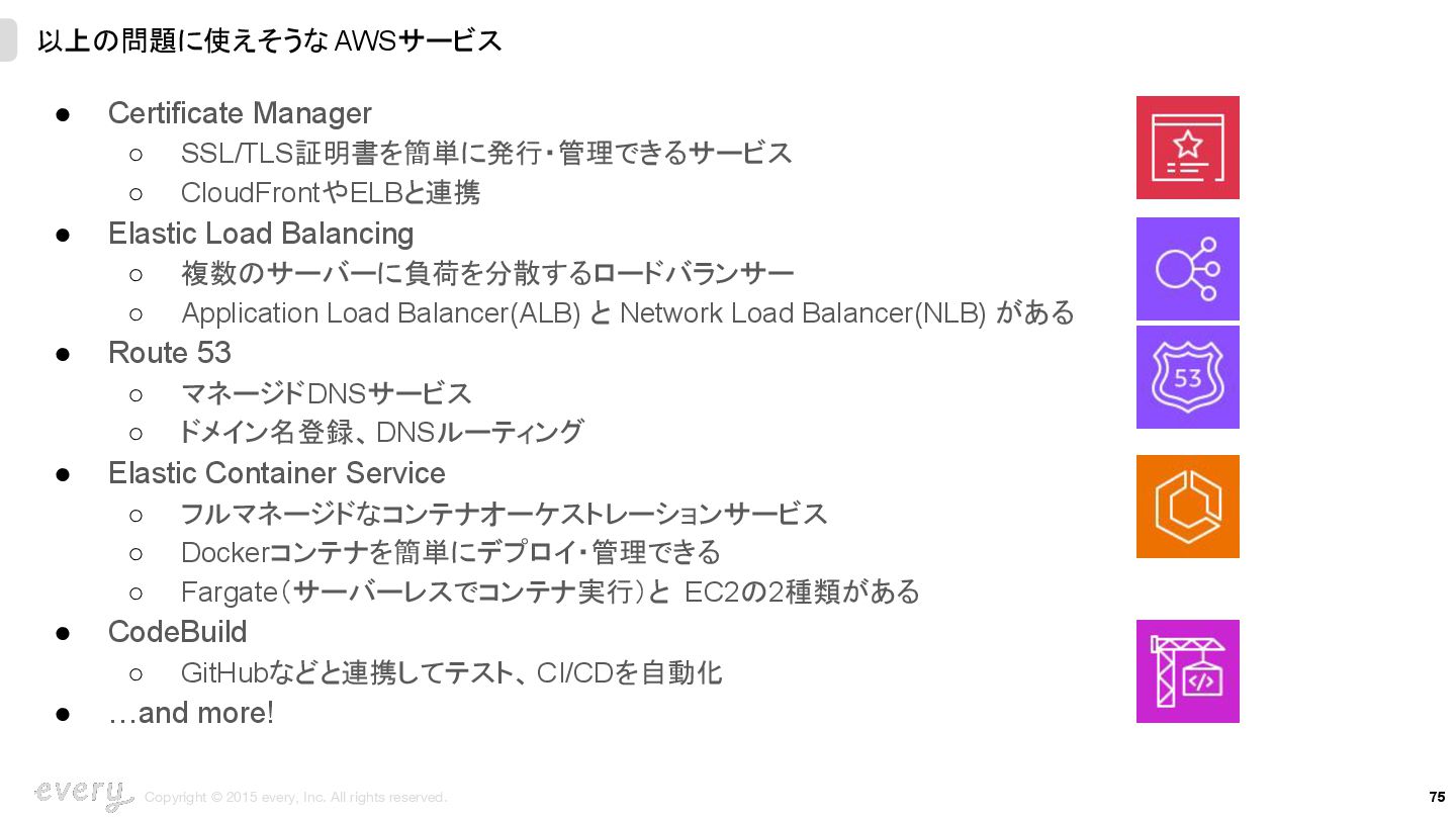 Certificate Manager ◦ SSL/TLS証明書を簡単に発行・管理できるサービス ◦ CloudFrontやELBと連携 • Elastic Load Balancing ◦ 複数のサーバーに負荷を分散するロードバランサー ◦ Application Load Balancer(ALB) と Network Load Balancer(NLB) がある • Route 53 ◦ マネージドDNSサービス ◦ ドメイン名登録、DNSルーティング • Elastic Container Service ◦ フルマネージドなコンテナオーケストレーションサービス ◦ Dockerコンテナを簡単にデプロイ・管理できる ◦ Fargate(サーバーレスでコンテナ実行)と EC2の2種類がある • CodeBuild ◦ GitHubなどと連携してテスト、 CI/CDを自動化 • …and more! 以上の問題に使えそうな AWSサービス