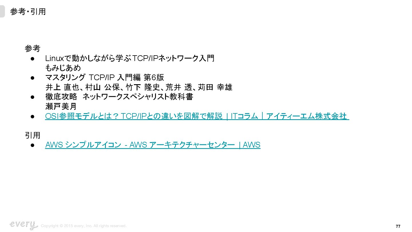 • Linuxで動かしながら学ぶ TCP/IPネットワーク入門 もみじあめ • マスタリング TCP/IP 入門編 第6版 井上 直也、村山 公保、竹下 隆史、荒井 透、苅田 幸雄 • 徹底攻略 ネットワークスペシャリスト教科書 瀬戸美月 • OSI参照モデルとは?TCP/IPとの違いを図解で解説 | ITコラム|アイティーエム株式会社 引用 • AWS シンプルアイコン - AWS アーキテクチャーセンター | AWS 参考・引用