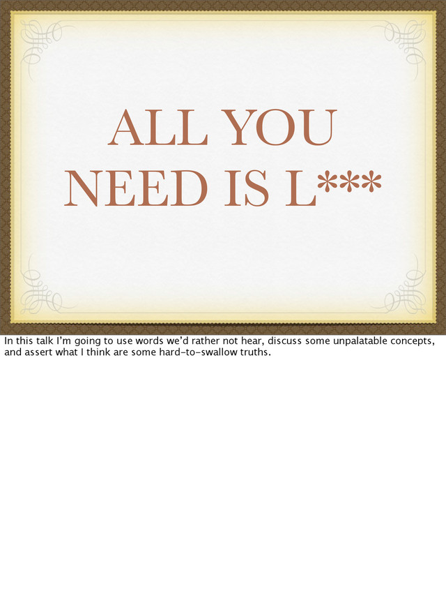 Be warned that this talk contained words that are not used in polite company, discussed unpalatable concepts, and made some hard-to-swallow assertions.
