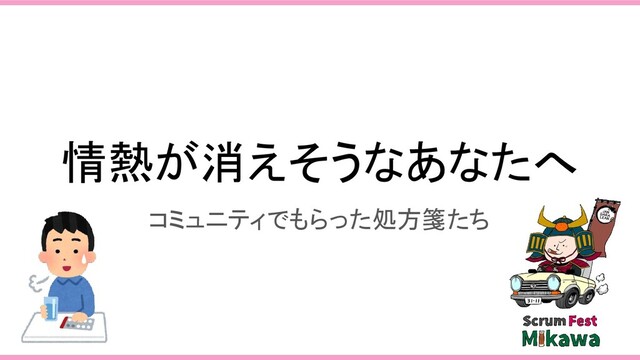 Yusuke Uchida / Emi Kobayashi - 情熱が消えそうなあなたへ - コミュニティでもらった処方箋たち https://confengine.com/conferences/scrum-fest-mikawa-2021/proposal/15966/-