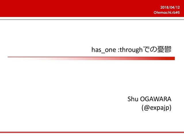 2018/04/12 Otemachi.rb#5 has_one :through Shu OGAWARA (@expajp)