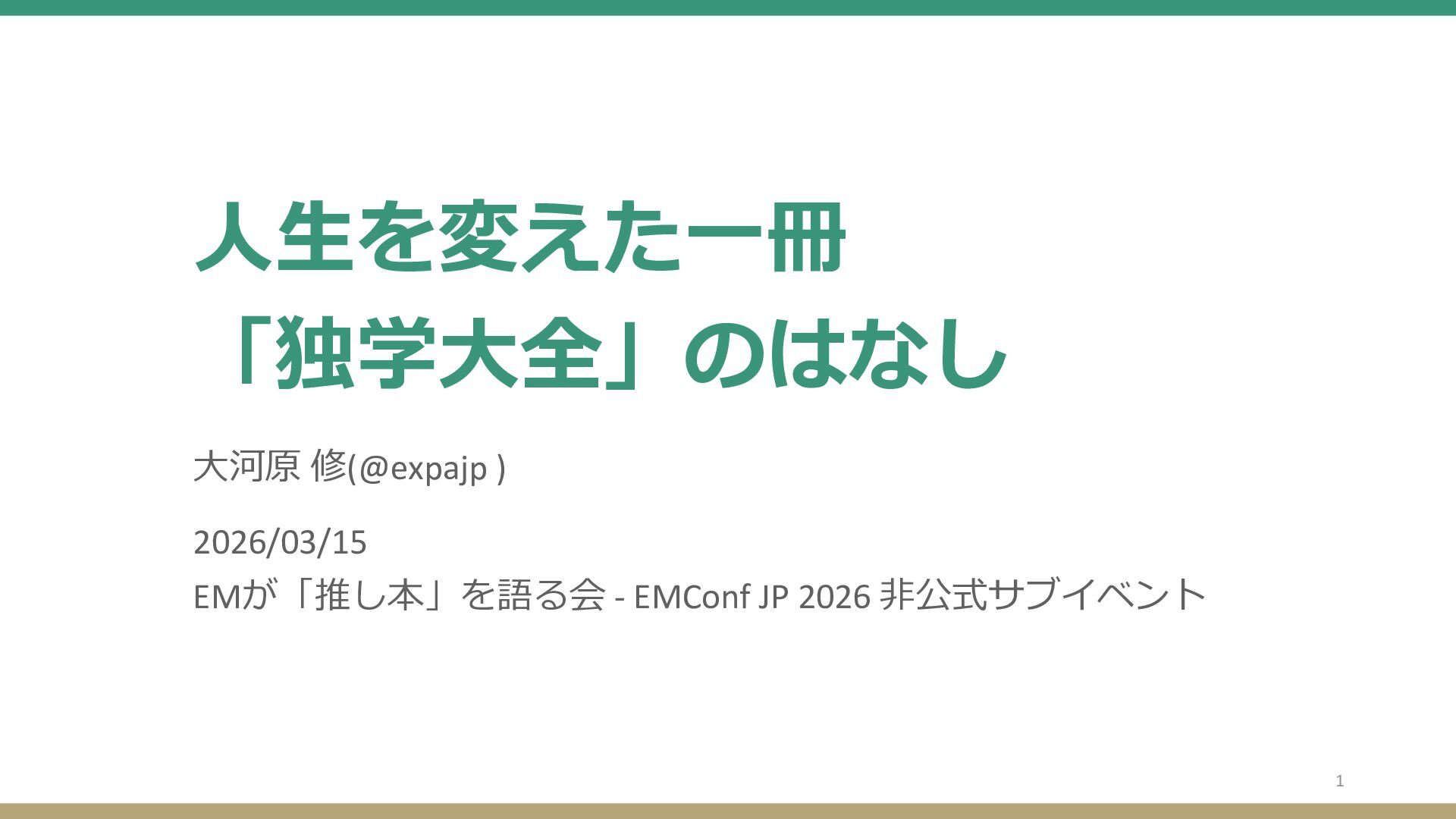 ⼈⽣を変えた⼀冊 「独学⼤全」のはなし ⼤河原 修(@expajp ) 2026/03/15 EMが「推し本」を語る会 - EMConf JP