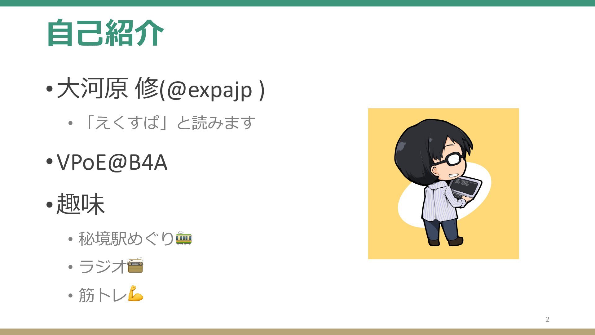 •⼤河原 修(@expajp ) • 「えくすぱ」と読みます •VPoE@B4A •趣味 • 秘境駅めぐり🚃 •