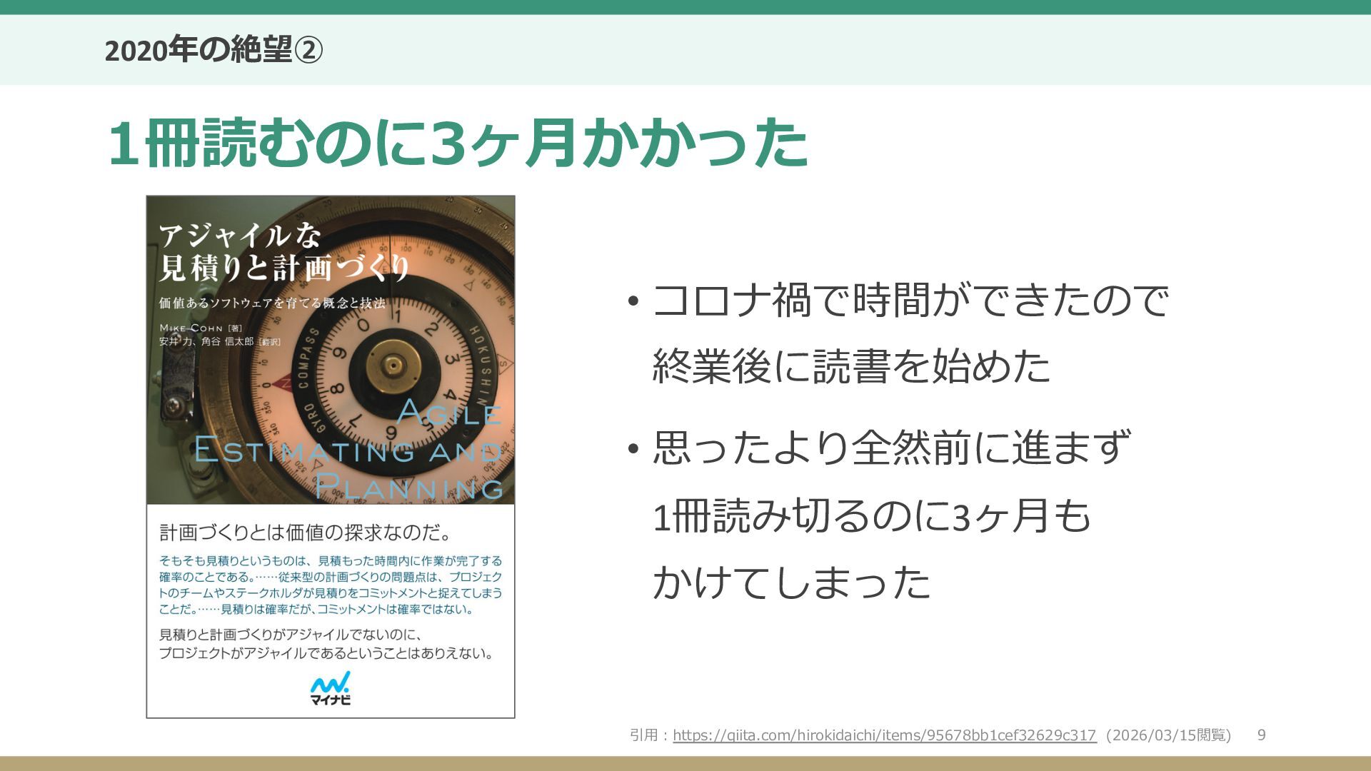 9 2020年の絶望② • コロナ禍で時間ができたので 終業後に読書を始めた • 思ったより全然前に進まず 1冊読み切るのに3ヶ⽉も かけてしまった 引⽤︓https://qiita.com/hirokidaichi/items/95678bb1cef32629c317