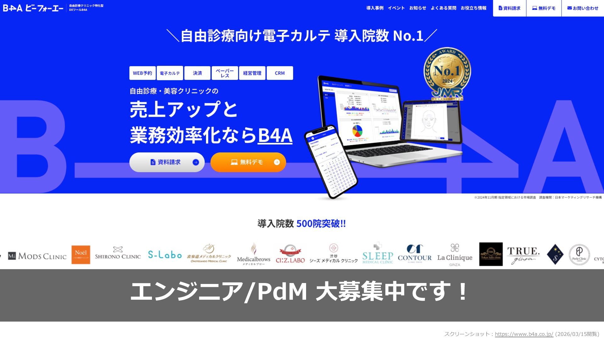 スクリーンショット︓https://www.b4a.co.jp/ (2026/03/15閲覧) エンジニア/PdM ⼤募集中です︕