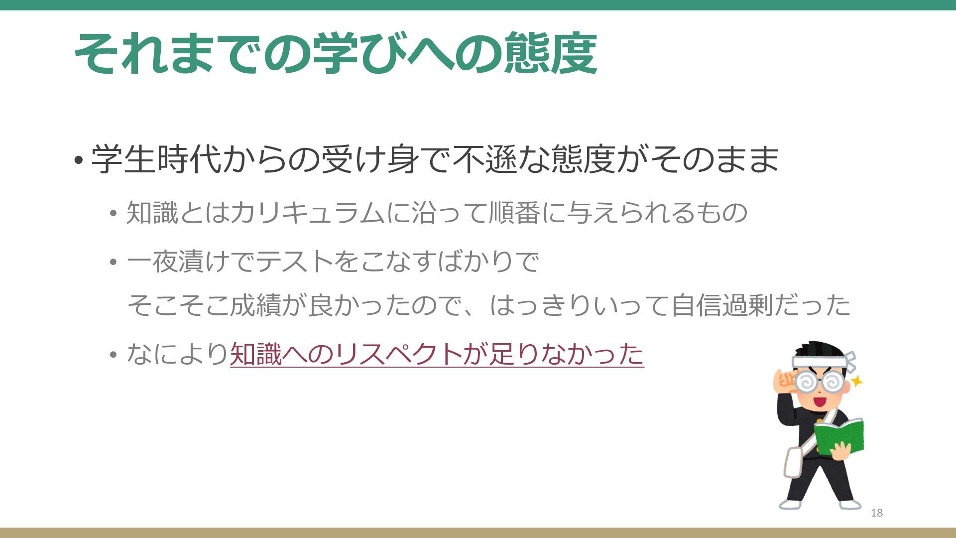 • 学⽣時代からの受け⾝で不遜な態度がそのまま • 知識とはカリキュラムに沿って順番に与えられるもの • ⼀夜漬けでテストをこなすばかりで そこそこ成績が良かったので、はっきりいって⾃信過剰だった • なにより知識へのリスペクトが⾜りなかった 18