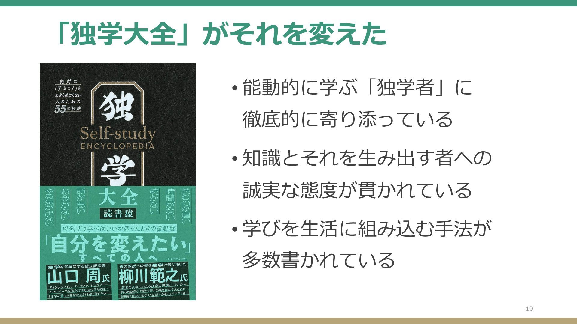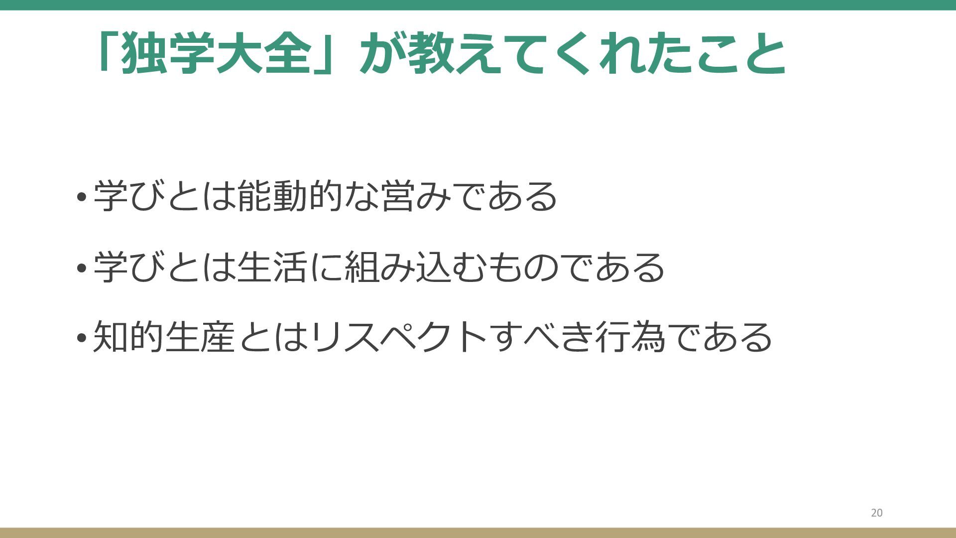 • 能動的に学ぶ「独学者」に 徹底的に寄り添っている • 知識とそれを⽣み出す者への 誠実な態度が貫かれている • 学びを⽣活に組み込む⼿法が 多数書かれている 19
