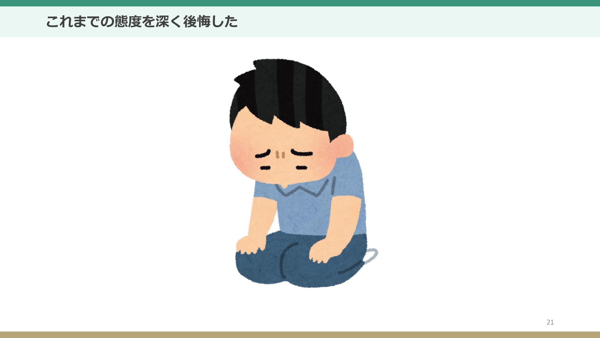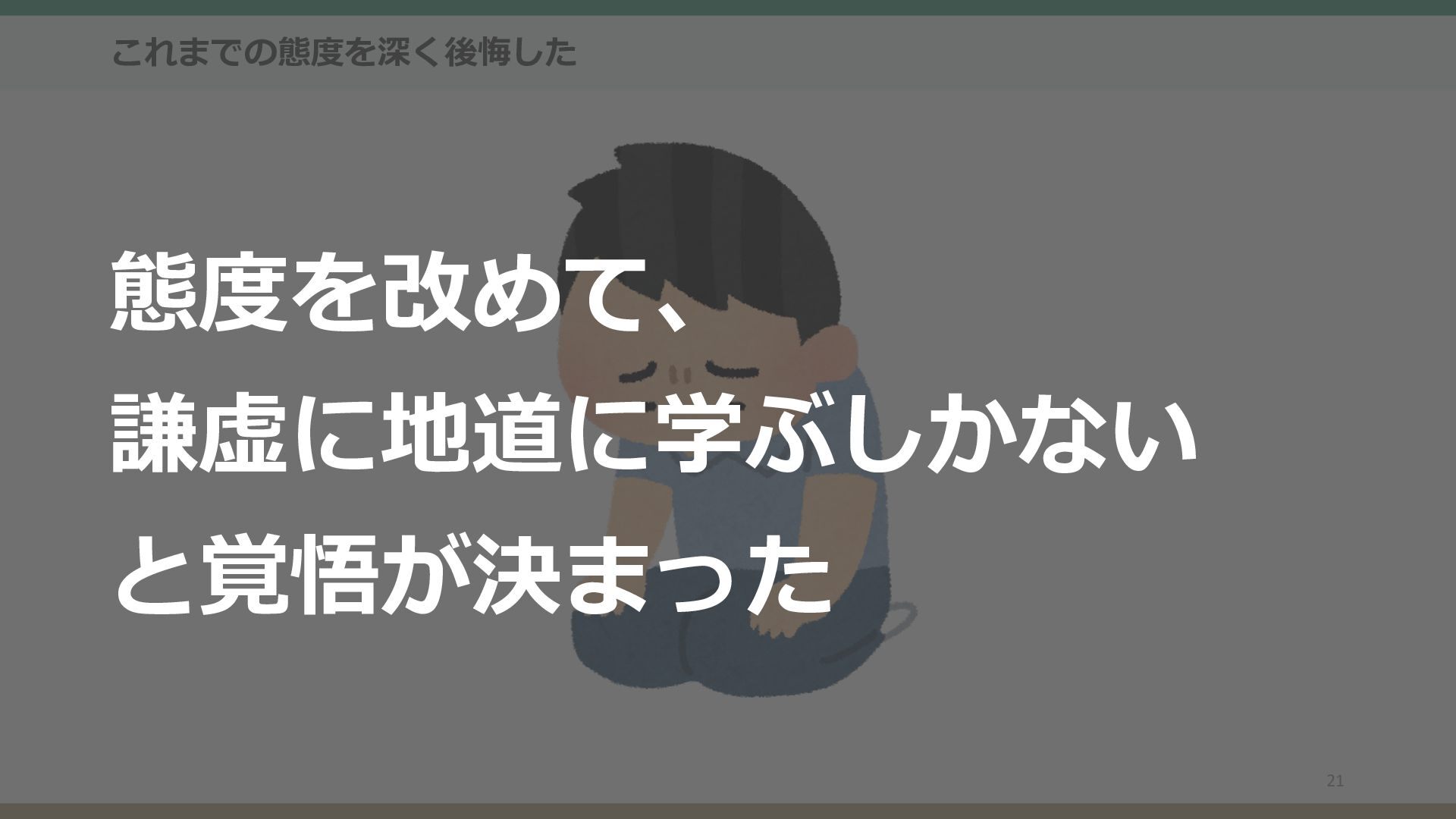 21 これまでの態度を深く後悔した 態度を改めて、 謙虚に地道に学ぶしかない と覚悟が決まった