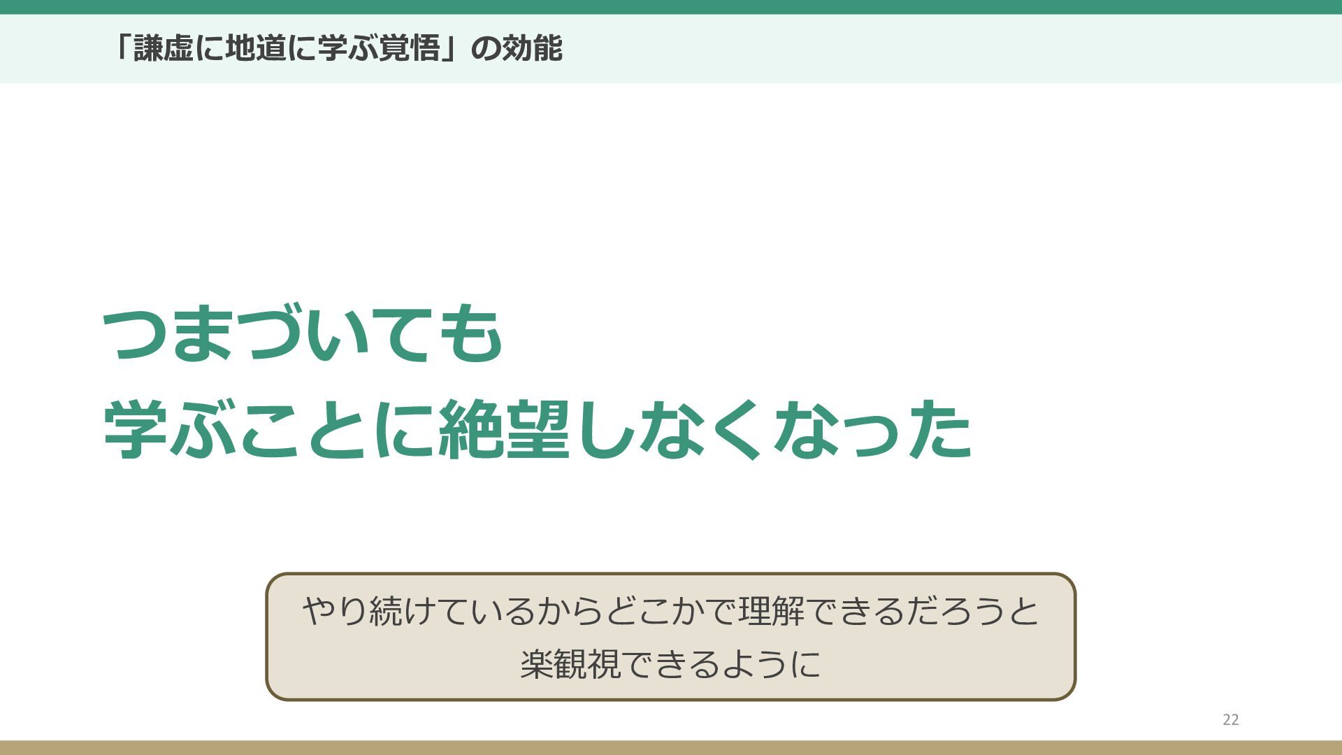 22 「謙虚に地道に学ぶ覚悟」の効能 つまづいても 学ぶことに絶望しなくなった やり続けているからどこかで理解できるだろうと 楽観視できるように