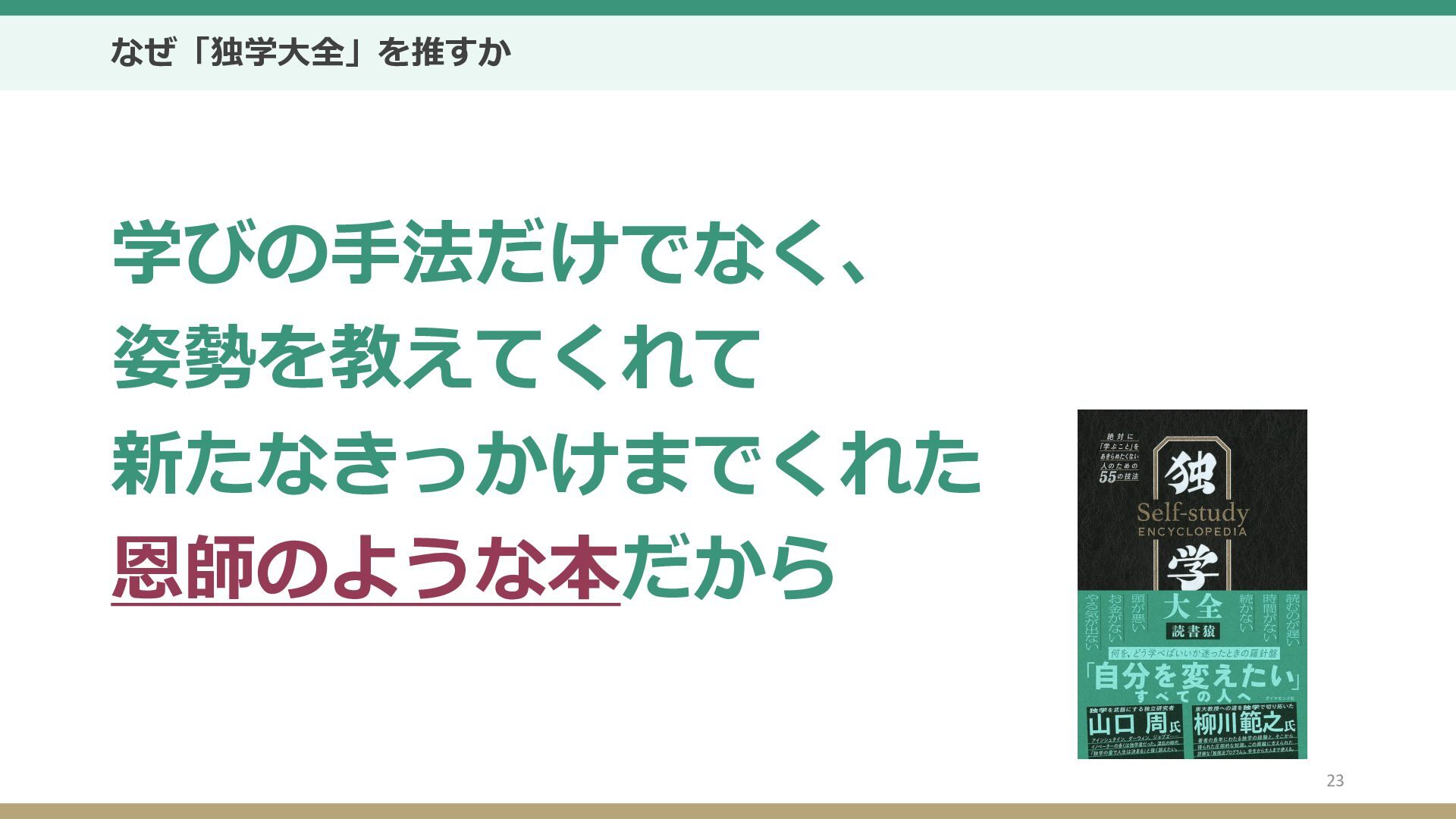 23 なぜ「独学⼤全」を推すか 学びの⼿法だけでなく、 姿勢を教えてくれて 新たなきっかけまでくれた 恩師のような本だから