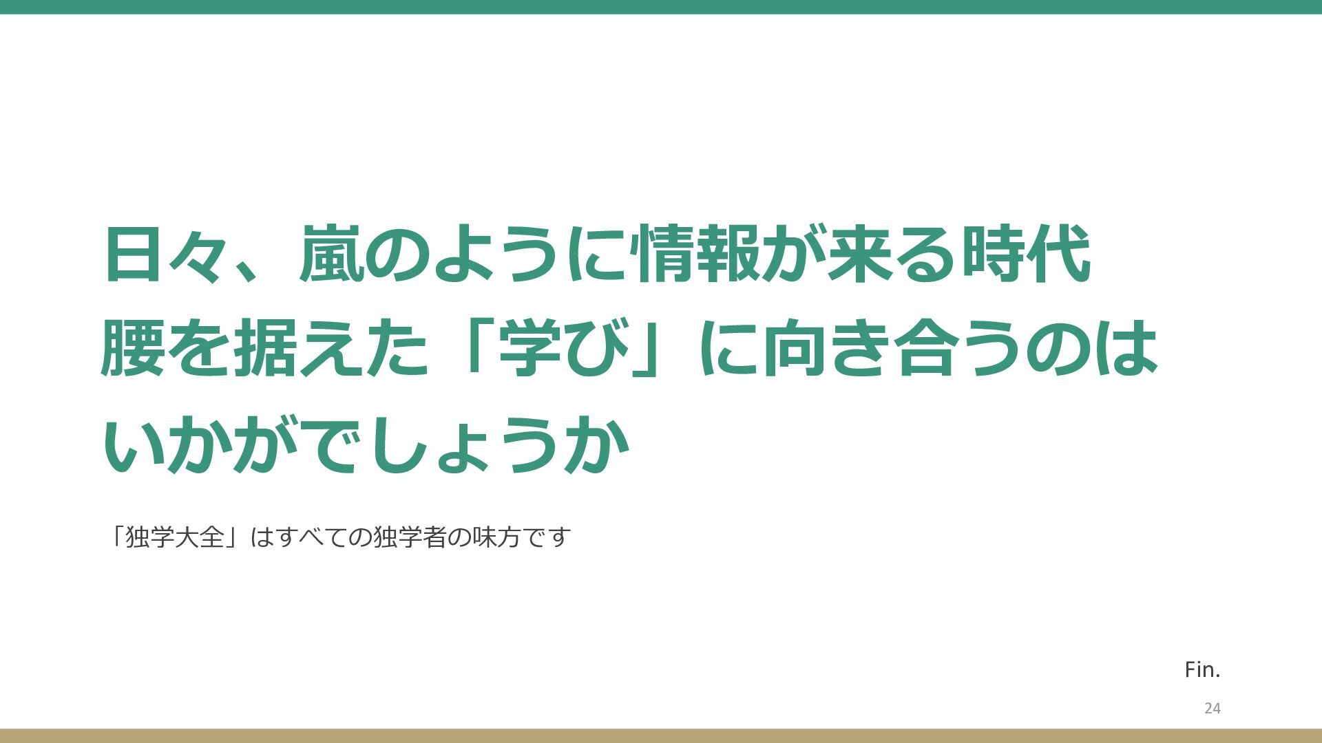 ⽇々、嵐のように情報が来る時代 腰を据えた「学び」に向き合うのは いかがでしょうか 24 「独学⼤全」はすべての独学者の味⽅です Fin.