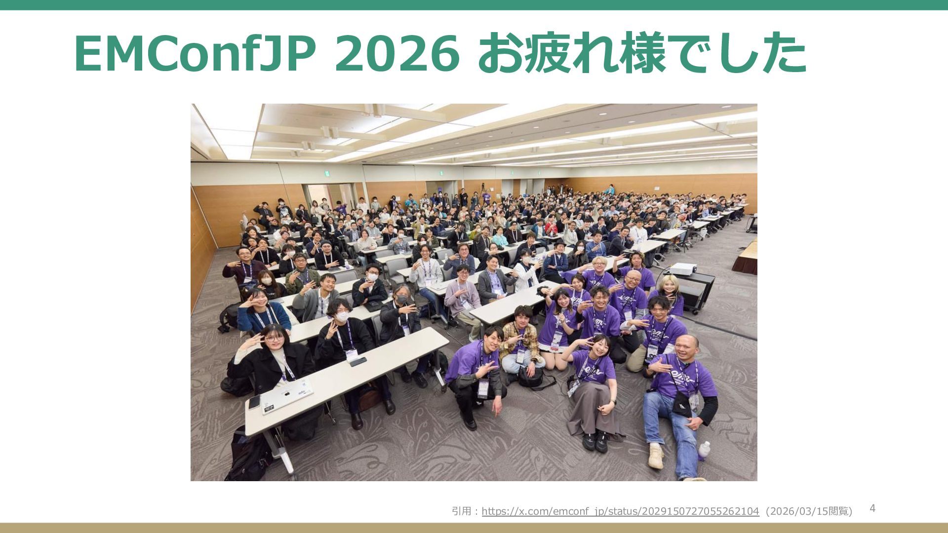 4 EMConfJP 2026 お疲れ様でした 引⽤︓https://x.com/emconf_jp/status/2029150727055262104 (2026/03/15閲覧)