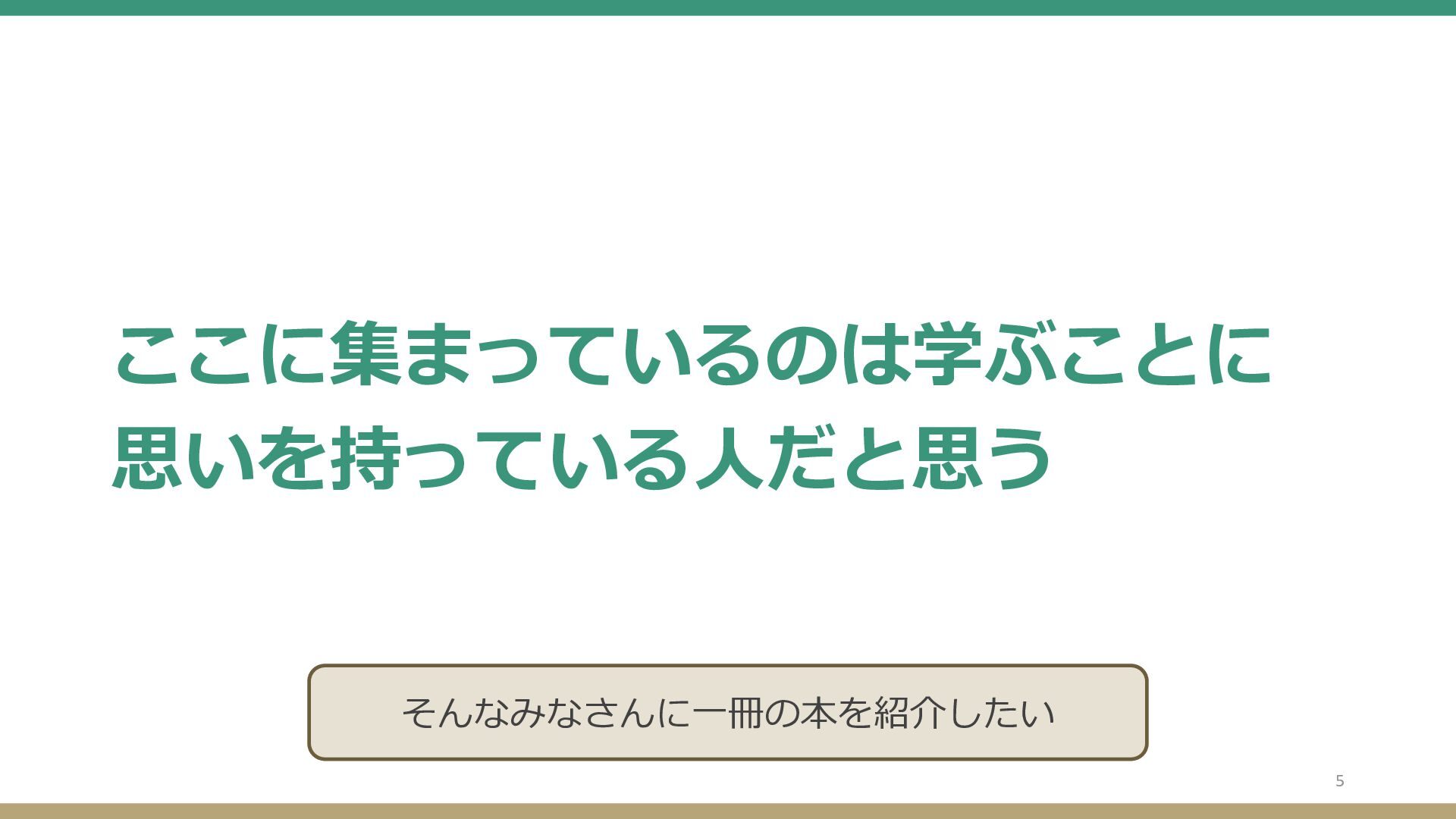 ここに集まっているのは学ぶことに 思いを持っている⼈だと思う 5 そんなみなさんに⼀冊の本を紹介したい