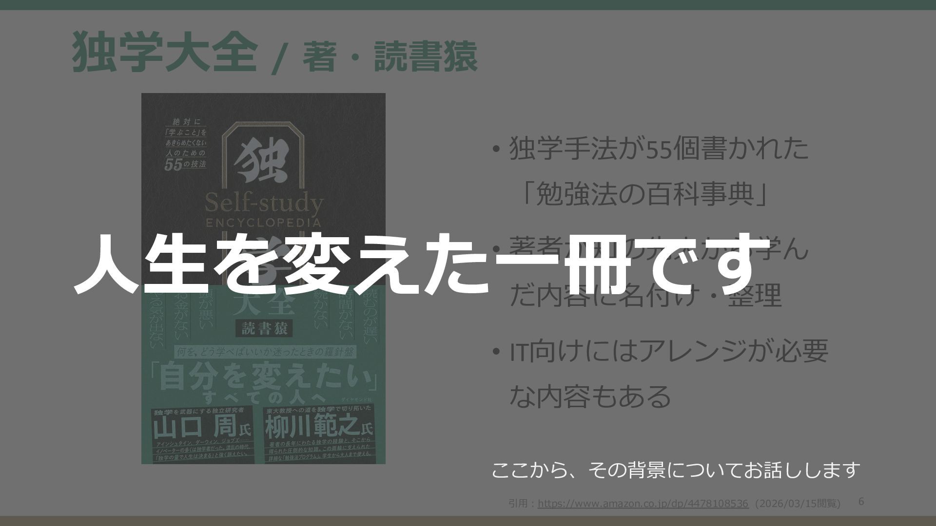 • IT向けにはアレンジが必要 な内容もある 引⽤︓https://www.amazon.co.jp/dp/4478108536 (2026/03/15閲覧) ⼈⽣を変えた⼀冊です ここから、その背景についてお話しします
