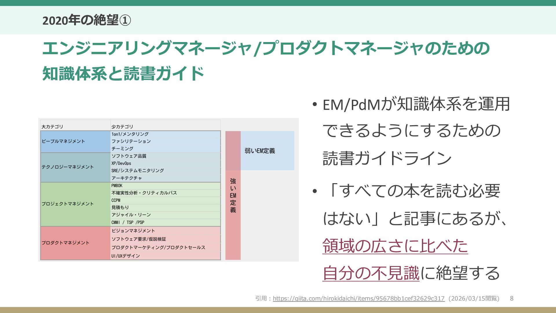 8 2020年の絶望① エンジニアリングマネージャ/プロダクトマネージャのための 知識体系と読書ガイド • EM/PdMが知識体系を運⽤ できるようにするための 読書ガイドライン • 「すべての本を読む必要