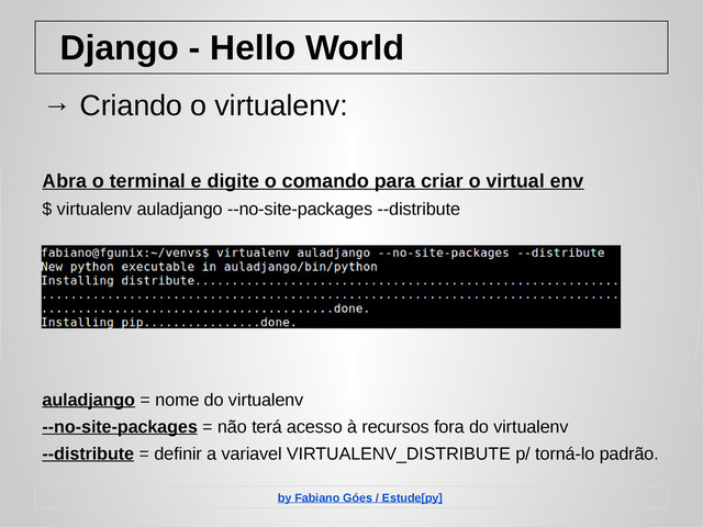 terminal e digite o comando para criar o virtual env $ virtualenv auladjango --no-site-packages --distribute auladjango = nome do virtualenv --no-site-packages = não terá acesso à recursos fora do virtualenv --distribute = definir a variavel VIRTUALENV_DISTRIBUTE p/ torná-lo padrão. by Fabiano Góes / Estude[py]